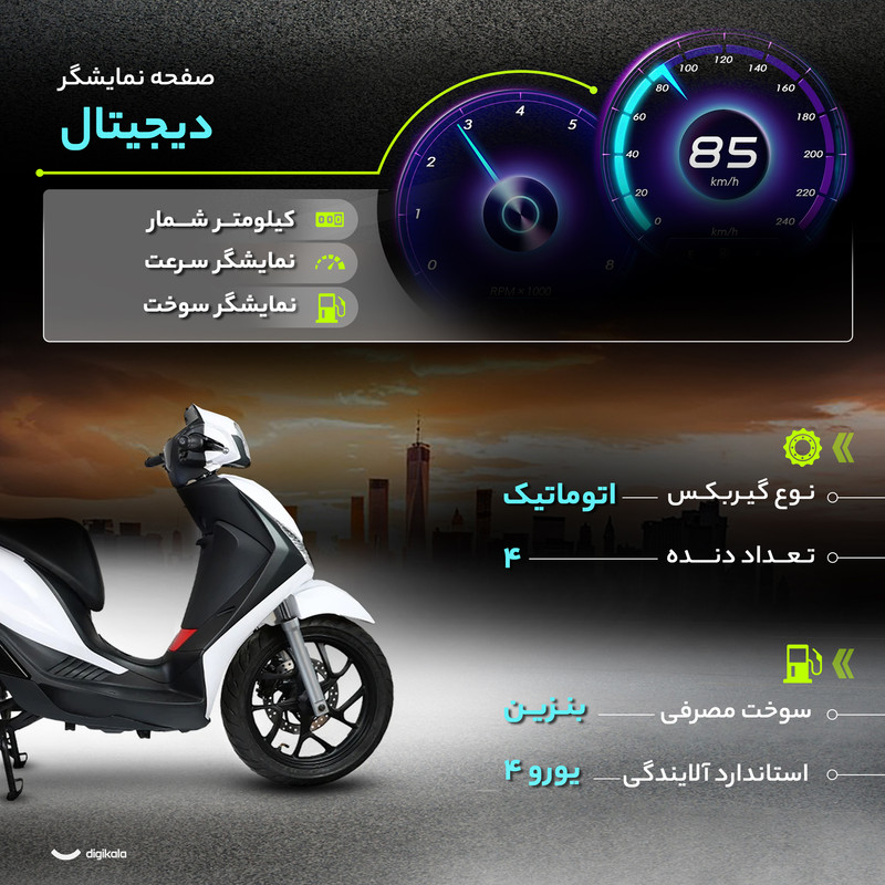 نمایشگر دیجیتال، چراغ LED جلو، رینگهای آلومینیومی اسپرت و فضای حمل بار زیر زین از دیگر امکانات این اسکوتر است. نهایت سرعت آن حدود ۹۲ کیلومتر بر ساعت است که برای کاربرد شهری ایدهآل محسوب میشود.