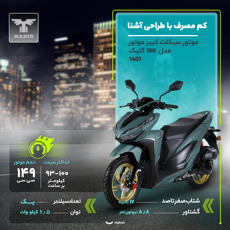 موتور سیکلت کبیر کلیک 150، با بهرهگیری از قطعات باکیفیت و فناوریهای پیشرفته، یک اسکوتر شهری با دوام و ایمن است. قلب تپنده این اسکوتر مدل سال ۱۴۰۱، یک پیشرانه تک سیلندر ۱۴۹ سیسی مایعخنک است که توانی معادل ۷ کیلووات تولید میکند. سیستم انتقال قدرت اتوماتیک آن از کلاچ ژاپنی برند FCC و تسمه باکیفیت ژاپنی بهره میبرد که عملکردی نرم، روان و با دوام طولانیمدت را برای این موتور بنزینی تضمین میکند.