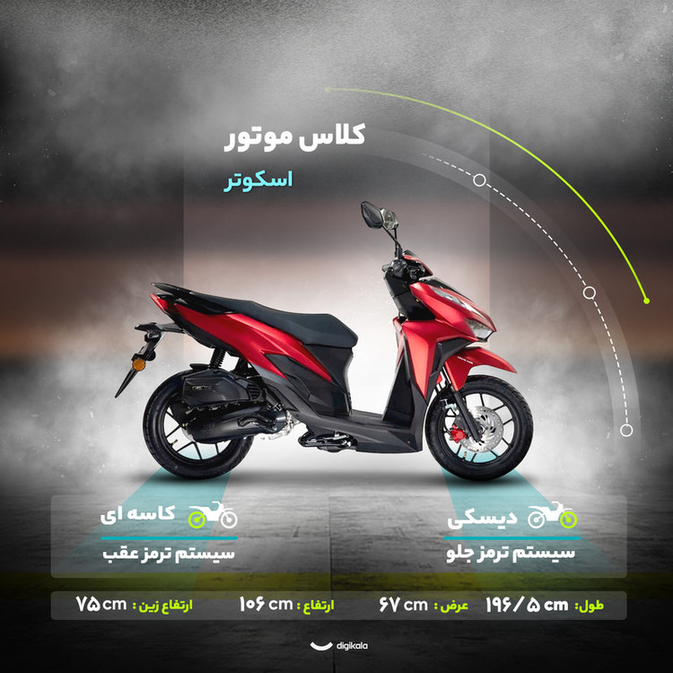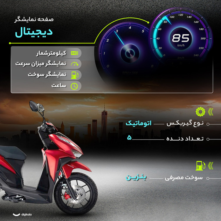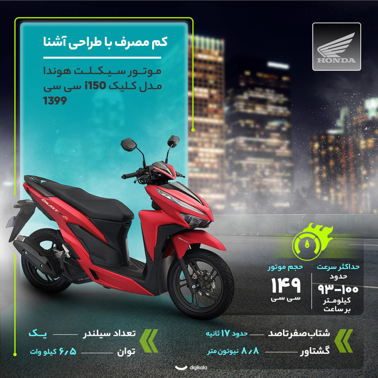 قلب تپنده آن یک پیشرانه تک سیلندر ۱۴۹ سیسی مایعخنک است که توانی برابر با ۶.۵ کیلووات تولید میکند. این موتور بنزینی با گیربکس اتوماتیک، سواری نرم و روانی را ارائه میدهد و با مصرف سوخت پایین ۲.۵ لیتر در هر صد کیلومتر، گزینهای اقتصادی برای استفاده روزمره است. طراحی اسپرت آن با چراغ جلوی LED و صفحه نمایشگر دیجیتال تکمیل میشود. این اسکوتر ۱۰۳.۵ کیلوگرمی با ترمز جلوی دیسکی، توقفی مطمئن را فراهم کرده و فضای حمل بار زیر زین نیز برای قرار دادن وسایل ضروری، بسیار کاربردی است. در نهایت، موتورسیکلت هوندا کلیک i150 برای کسانی که به دنبال ترکیبی از استایل و راحتی در یک اسکوتر شهری هستند، انتخابی ایدهآل است.