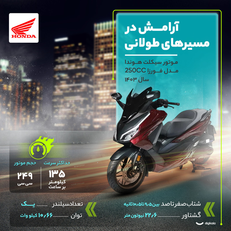 موتورسیکلت هوندا مدل فورزا 250CC سال 1403، از سری اسکوترهای لوکس و قدرتمند برند ژاپنی هوندا است که برای استفاده شهری و جادهای طراحی شده. این مدل با طراحی مدرن، عملکرد فنی بالا و سیستمهای ایمنی پیشرفته، انتخابی ایدهآل برای علاقهمندان به رانندگی راحت و مطمئن محسوب میشود.