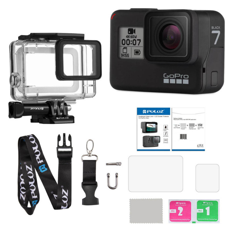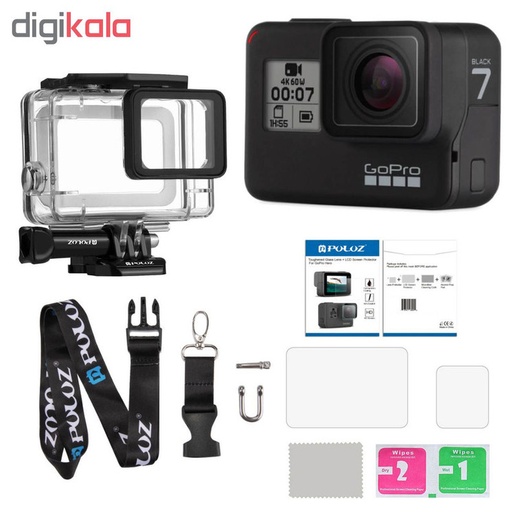 دوربین فیلم برداری ورزشی گوپرو مدل HERO7 Black Quick Stories به همراه قاب ضد آب و بندآویز و محفظ صفحه و لنز پلوز