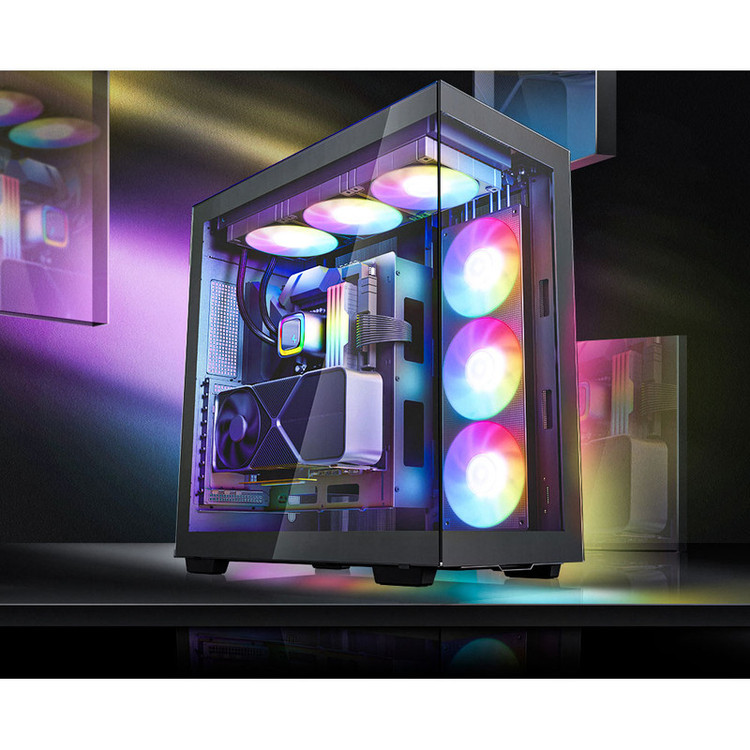 سیستم خنککنندگی این کیس انعطافپذیر و فوقالعاده پیشرفته است. امکان نصب مجموعاً ۹ عدد فن در سقف، کف و قسمت کناری وجود دارد. سه فن ARGB بهصورت پیشفرض نصب شدهاند. این کیس از نصب فنهایی با ابعاد ۱۲۰ / ۱۴۰ / ۱۸۰ / ۲۰۰ میلیمتری پشتیبانی میکند. همچنین قابلیت نصب رادیاتورهای واترکولینگ تا اندازه ۴۲۰ میلیمتر در سقف، کف و کنارهها را دارد.