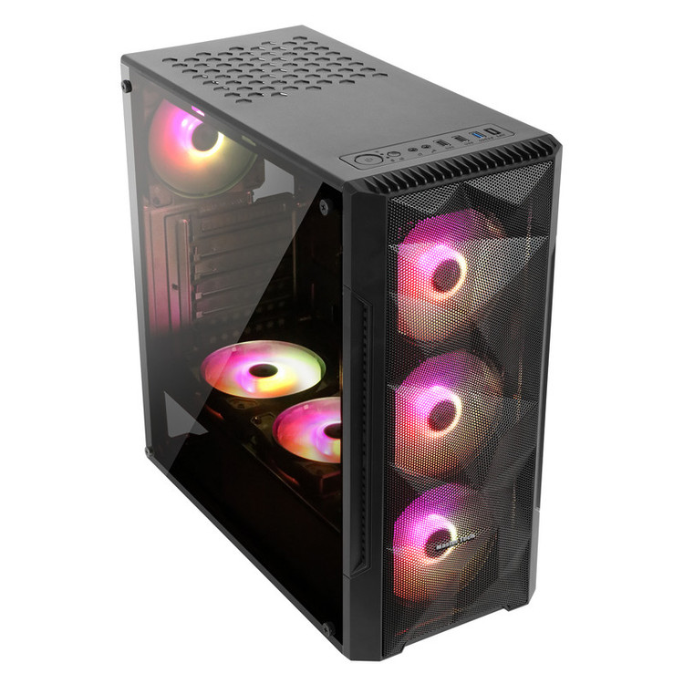 کیس Hunter جدید با فرم فاکتور Mini Tower در دو مدل Glass و Metal در دسته بندی کیس گیمینگ پایین رده عرضه شده است. ابعاد این کیس 415×400×190 میلی متر است و اندازه نسبتاً کوچک آن را میتوان مزیت و محدودیت این کیس نامید. کیس Hunter فضای کمی اشغال میکند و وزن آن سبک است. اما کوچک بودن کیس قطعاً موجب وجود محدودیت در استفاده از قطعات مختلف میگردد. بدنه فلزی کیس از جنس استیل ضد زنگ بوده و استحکام آن فوق العاده است پنل جلویی مش باعث ایجاد جریان هوای مطلوب داخل کیس میگردد و بهره بردن از چهار عدد فن خنک کننده تک رنگ LED دار علاوه بر کمک به ایجاد جریان هوا، به آن زیبایی میبخشد. درب کناری کیس Hunter در دو مدل فلزی (Metal) و شیشهای (Glass) طراحی شده و دست کاربرد را در انتخاب بر اساس نیاز و سلیقه شخصی، باز گذاشته است. این کیس فضایی برای نصب درایو نوری ندارد و رادیاتور خنک کننده مایع 120 در بخش پشتی کیس قابل نصب است. دکمه های پنل جلویی کیس در قسمت بالای کیس قرار گرفته و یک عدد درگاه USB3.0 و دو عدد USB2.0 به همراه ورودی و خروجی Audio در آن تعبیه شده است.