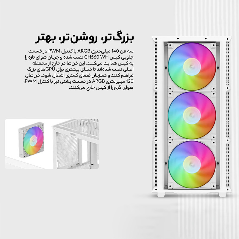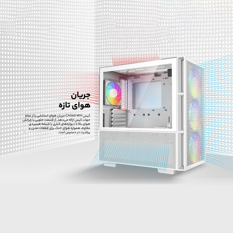 CH560 Digital WH دارای فرمفاکتور ATX است که استاندارد جدیدی را در عملکرد خنککنندگی خود ایجاد میکند. زیرا دارای توری مشبک در قسمت جلو به همراه سه فن از پیش نصب شده ARGB با ابعاد 140 میلیمتر و نیز یک فن ARGB در ابعاد 120 میلیمتر خواهد بود. همچنین امکان نصب دو فن اضافه با ابعاد 120 میلیمتر در قسمت PSU Shroud را میدهد. بنابراین، هوای خنک همیشه برای قطعات سختافزاری مدرن که تشنه انرژی هستند، در دسترس خواهد بود.