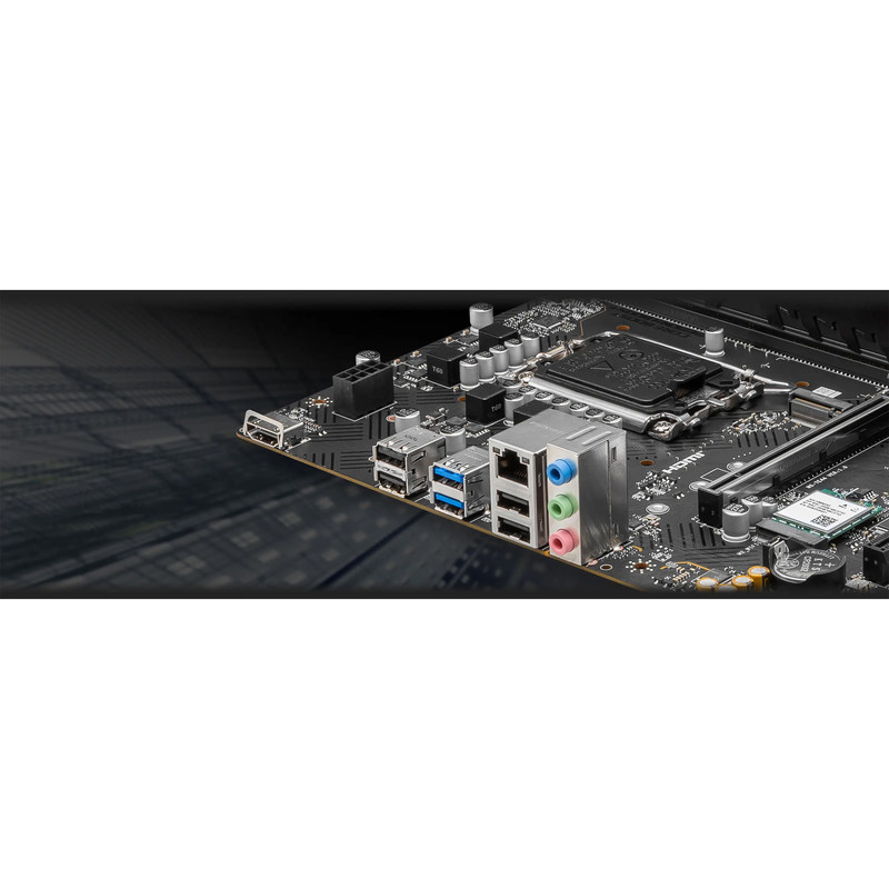 پنلهای جلویی و پشتی شامل تعداد زیادی پورت USB ۲.۰ و USB 3.2 برای اتصال دستگاههای مختلف است. کارت صدای Realtek ALC۸۹۷ با پشتیبانی از صدای ۷.۱ کاناله، کیفیت صوتی مناسبی را تضمین میکند. فرم فاکتور microATX و وجود چهار نشانگر EZ Debug برای عیبیابی آسان، کار با این مادربرد را ساده میکند. همچنین پشتیبانی از اورکلاک رم (Intel XMP) در این مادربرد، امکان افزایش کارایی حافظه را فراهم میکند.