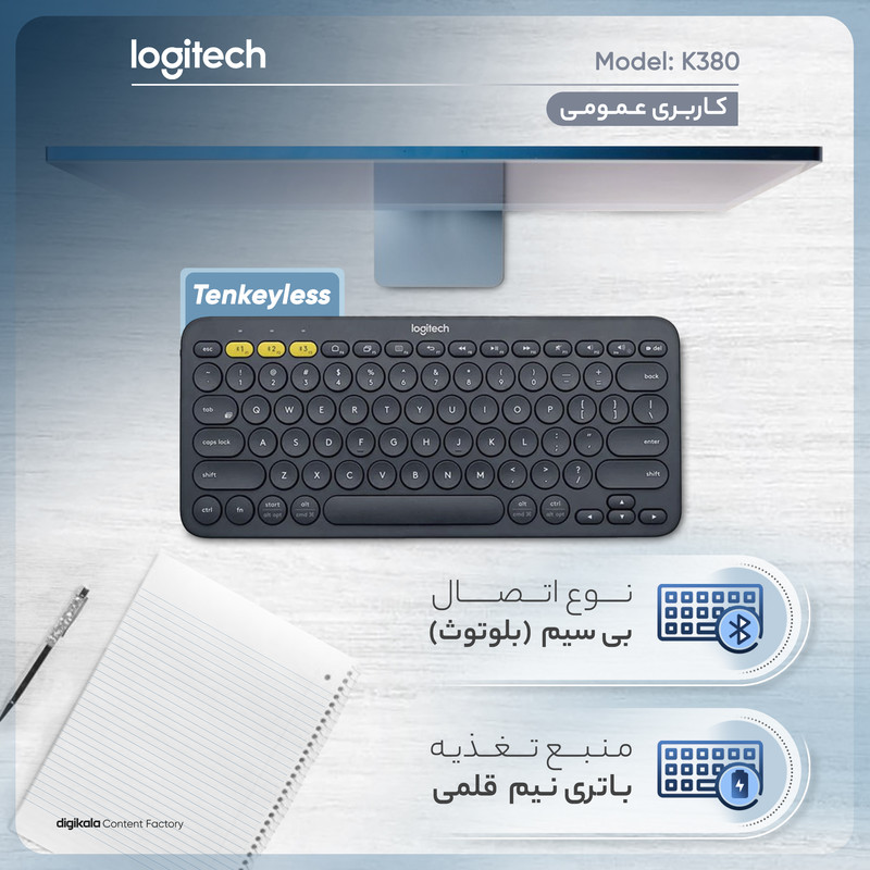 کیبورد لاجیتک مدل K380 برای مصارف خانگی و اداری ایدهال است. این کیبور بهاندازهای جمعوجور است که شما بهراحتی میتوانید آن را جابجا کنید. این کیبورد از طریق دانگل بلوتوث به کامپیوتر متصل میشود و تا 10 متر مسافت بهخوبی پشتیبانی میکند. انرژی مورد نیاز این کیبورد از طریق 2 عدد باتری AAA تامین میشود و تا مدتها نیاز به تعویض مجدد نخواهند داشت. این کیبورد از طراحی ارگونومیکی خوبی برخوردار است بهگونهای که پس از چند ساعت کار با آن احساس خستگی در مچ دست احساس نخواهید کرد. از دیگر ویژگیهای این کیبورد جزیرهای بودن آن استکه برای محققان و حتی تمامی کسانی که با سیستمهای کامپیوتری کار میکنند بسیار عالی و با لذت است. شرکت لاجیتک یکی از بزرگترین تولیدکنندگان تجهیزات جانبی کامپیوتر است که محصولات باکیفیت و بادوامی روانهی بازار میسازد. اگر به دنبال یک کیبورد باکیفیت و خوشساخت هستید، K380 بهخوبی قادر است نیازهای شما را پاسخگو باشد.