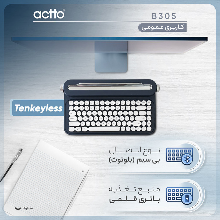 کیبورد بیسیم اکتو مدل B305، گزینهای جذاب برای کاربرانی است که بهدنبال صفحهکلیدی جمعوجور و سبک اما در عین حال چشمنواز هستند. فرم Tenkeyless این کیبورد، با حذف بخش نامپد، ابعاد کلی را به ۳۳۱ در ۱۴۸ در ۲۹ میلیمتر رسانده و وزن آن ۴۶۵ گرم است. بدنه پلاستیکی در کنار رنگبندی پاستلی و طراحی شبیه دستگاه تایپ قدیمی، حسی نوستالژیک و مدرن را همزمان تداعی میکند. این صفحهکلید از طریق بلوتوث نسخه پنج به رایانه یا تبلت و موبایل متصل میشود و تا ۱۰ متر برد موثر دارد.