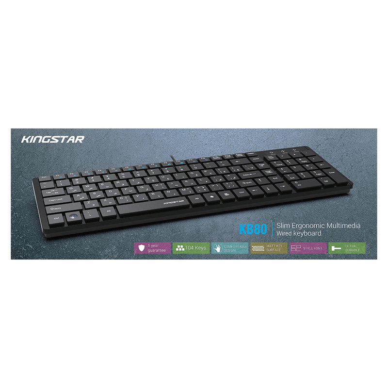 کیبورد کینگ استار مدل kb80 از نوع سیم دار میباشد و از طریق درگاه USB به کامپیوتر متصل میشود. این کیبورد دارای 110 کلید برای انجام فعالیتهای کامپیوتری است. همچنین کیبورد kb80 دارای 12 کلید میانبر نیز به منظور انجام سریعتر کارهاست که عبارتند از Favorites ,Stop, Power, E-mail, Mute ,Music, Play/Pause, Pre Track, Next Track, Volume +-, Web Home, My Computer. کیبورد کینگ استار مدل kb80 برای استفادههای روزمره مناسب میباشد. از دیگر ویژگیهای این کیبورد محصول کمپانی کینگ استار، طراحی کلیدها به گونهای که امکان تایپ کردن در مدت زمانی طولانی را فراهم میکند، دسترسی راحت به تمامی کلیدهای کاربردی، طراحی نرم و سایلنت کلیدها، با دوام و دارای کلیدهای مات میباشد.