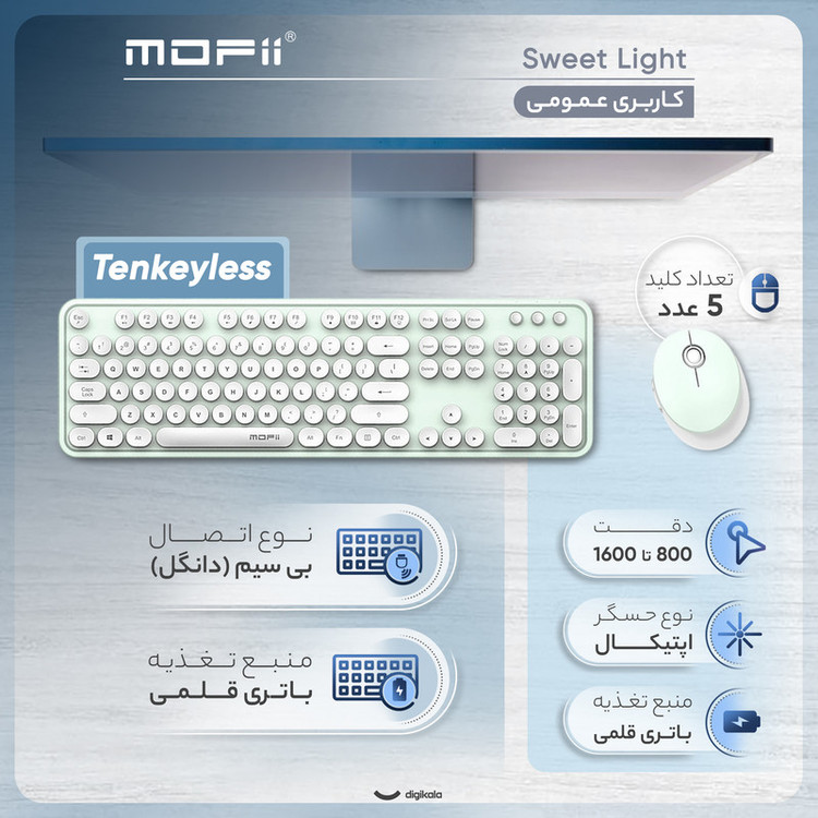 ست کیبورد و ماوس بیسیم مافی مدل Sweet Light، ترکیبی از طراحی زیبا، ارگونومیک و عملکرد بیسیم باکیفیت را ارائه میدهد. این مجموعه برای کاربران خانگی و اداری طراحی شده و به دلیل رنگبندی خاص و متفاوت، توجه زیادی را به خود جلب کرده است. بیشتر کیبوردها و ماوسهای موجود در بازار دارای رنگهای تیره و معمولی هستند، اما مافی در این مدل با ارائه طیف رنگهای متنوع، گزینهای منحصربهفرد برای کاربرانی است که به دکوراسیون و زیبایی میز کار خود اهمیت میدهند. کیبورد این مجموعه ۱۰۶ کلید نرم و خوشساخت دارد که تجربه تایپ روان و بیصدا را برای کاربر فراهم میکند. طراحی ارگونومیک با زاویه ۶ درجهای، باعث کاهش خستگی مچ دست در استفاده طولانیمدت میشود. این کیبورد از طریق دانگل USB به سیستم متصل شده و با تمامی سیستمعاملها سازگار است. از طرفی، ماوس ۵ کلیده این ست با دقت ۱۶۰۰ DPI، عملکرد دقیق و سریع را در اختیار کاربران قرار میدهد. این ماوس دارای دکمههای بک و فوروارد است که جابهجایی بین صفحات مرورگر و برنامهها را سادهتر میکند. باتری این مجموعه عمر بالایی دارد و در حالت معمولی میتواند تا ۱۲ ماه بدون نیاز به تعویض کار کند. اتصال بیسیم پایدار تا برد ۱۰ متر و طراحی ارگونومیک، این مجموعه را به گزینهای مناسب برای کارهای روزمره و حرفهای تبدیل کرده است.