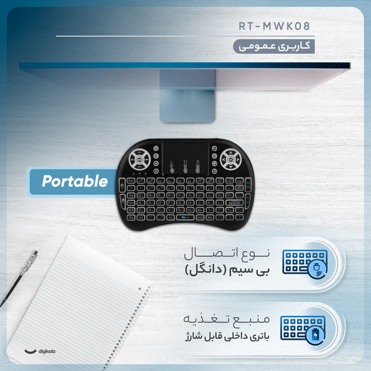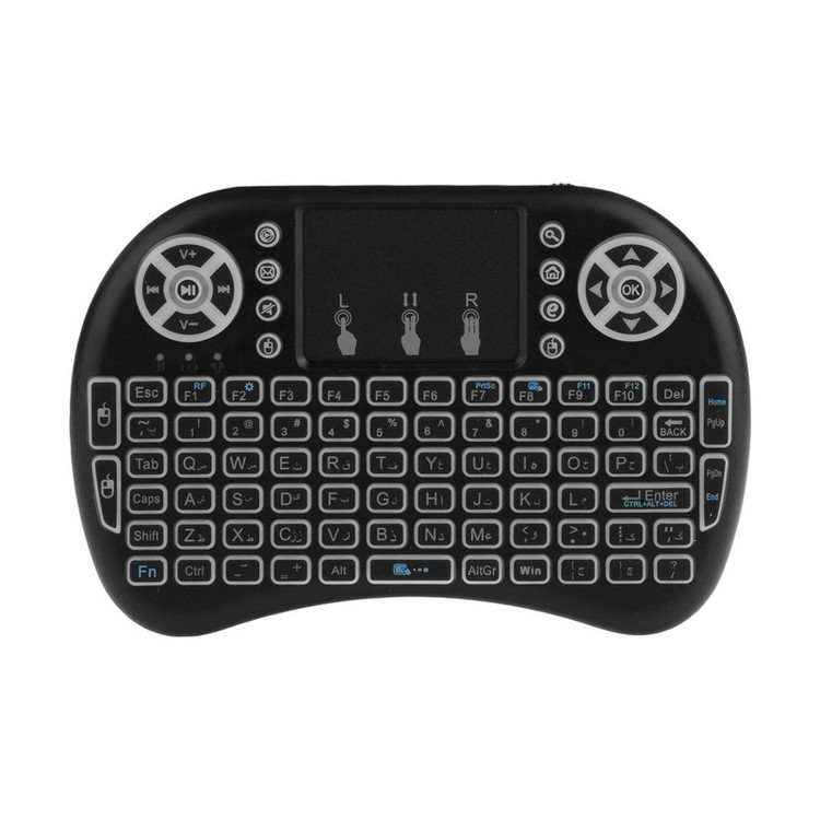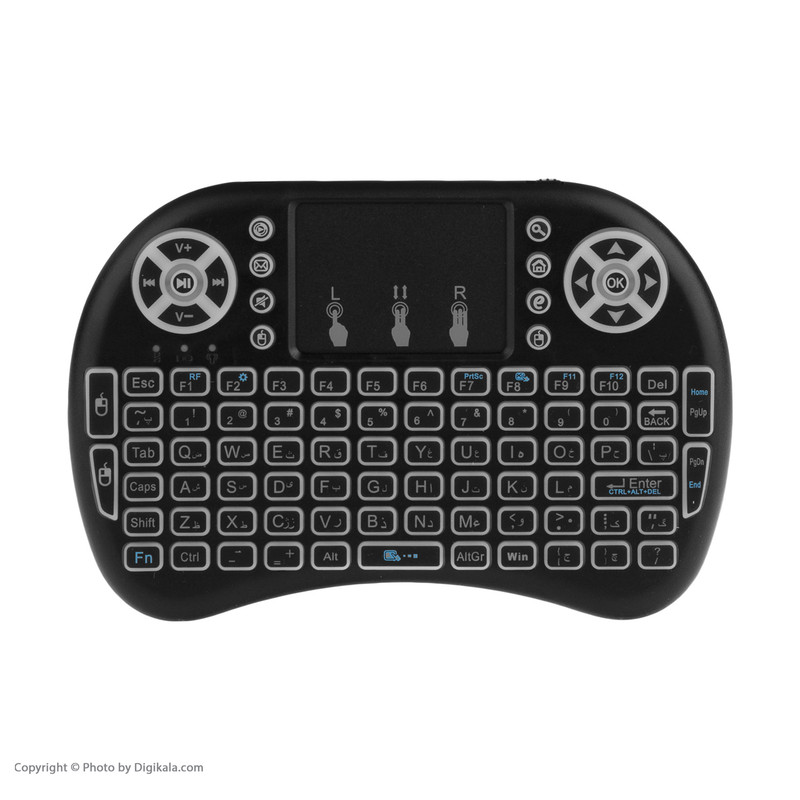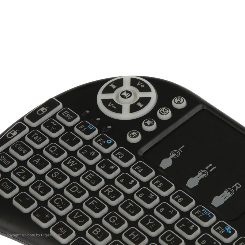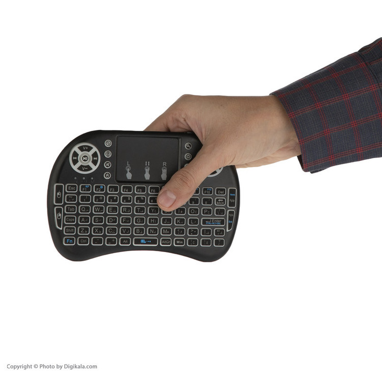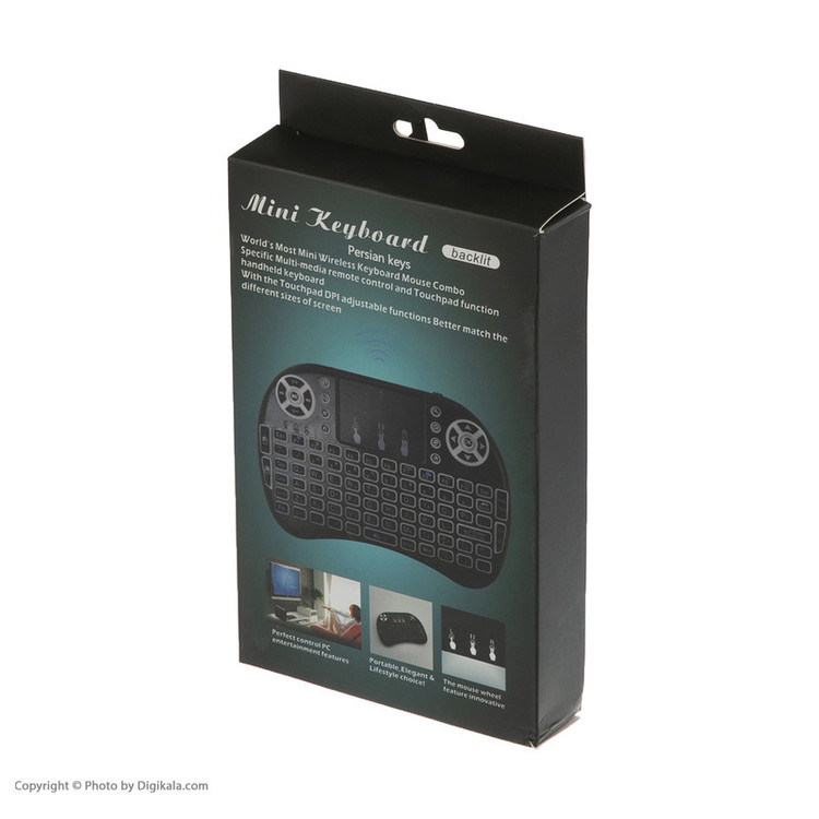 مینی کیبوردها به دلیل ابعاد جمع و جور و وزن سبک امکان همراه بردن را میسر کرده و به همین دلیل طرفداران زیادی دارد. مینی کیبورد حاضر دارای ویژگیهای منحصر به فردی است که آن را بسیار خاص نموده است. این مدل کوچکترین مینی کیبوردی است که تا به حال دیدهاید ولی با این حال همه کلیدهای کیبوردهای بزرگ و حتی بیشتر را در خود جای داده است که از آن جمله میتوان به کلیدهای مالتی مدیا، موس و پایین و بالا اشاره نمود و در کل دارای 92 کلید است. جالب این است که این مینی کیبورد دارای موس پد یا همان تاچید نیز است تا بدون نیاز به موس بتوانید کارهای خود را انجام دهید. این مینی کیبورد از طریق دانگلی که در پشت قرار دارد به سیستم کامپیوتر، اندروید باکس، تلویزیون اندرویدی، xbox و گوشی اندرویدی البته با یک تبدیل وصل شده و شما را شگفت زده مینماید و همچنین بسیار کاربردی برای عزیزانی که از اندروید باکسها و تلویزیونهای اندرویدی استفاده میکنند.. این محصول شاید نمونههای دیگری هم داشته باشد اما کیبورد فارسی در نظر گرفته شده برای این مینی کیبورد از قابلیتهای بسیار جذاب این محصول است. باتری از نوع لیتیومی قابل شارژ هم برای این مینی کیبورد در نظر گرفته شده است.