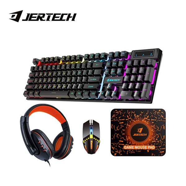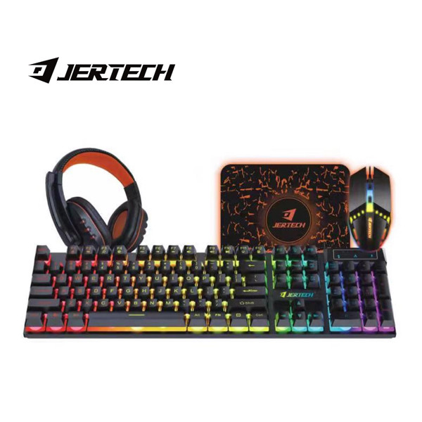 برند جرتک یکی از بزرگترین و معتبرترین برندهای فعال در حوزه تجهیزات مخصوص بازی است که انتخاب اول بسیاری از گیمرهای حرفهای بهشمار میآید. از ویژگی های بارز محصولات این برند می توان به کیفیت ساخت خوب نوآوری و تکنولوژی در کنار قیمت مناسب اشاره کرد . ست گیمینگ کیبورد موس، هدفون و پدموس که یک پک حرفه ایی و کامل برای یک گیمر میباشد که تمامی نیاز هایش را برآورده میکند. هر قسمت از این ست دارای مشخصات کامل و جامع خود میباشد که به شرح زیر است : کیبورد : دارای 104 کلید انگلیسی میباشد که به وسیله یک کابل از جنس PVC به PC و لپ تاپ شما متصل میشود . همچنین از نظر ظاهری این کیبورد بسیار زیباست و دارای نور RGB است که هنگام بازی و استفاده از آن هیجان بیشتری را به شما میدهد. این کیبورد داری 19 کلید anti-ghosting میباشد. هدفون : این هدفون بسیار زیبا و سبک دارای اتصال سیمی و رابط جک 3.5 میلی متری است. موس : موس این ست جذاب گیمینگ نیز دارای اتصال سیمی با کابلی به طول 1.5 متر میباشد که دارای ظاهری زیبا و سبک به وزن 127 گرم میباشد.این موس دارای نورپردازی میباشد که هنگام بازی در شب و ... میتوانید احساس هیجان زیادی را در بازی تجربه کنید. دقت آن 1600 DPI میباشد که دارای 4 دکمه نیز میباشد. موس پد: دارای ابعاد مناسب 24x28x3 سانتی متر میباشد که از جنس رویه ی پارچه ایی مخصوص و جنس زیرین از لاستیک جهت ایجاد اصطکاک و لیز نخوردگی میباشد.