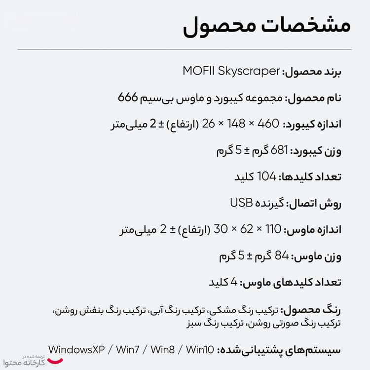 بسیاری از استفاده کنندگان از کامپیوتر به دنبال ماوس و صفحه کلیدی با رنگ خاص و دلخواه خود هستند و اکثر محصولات موجود در بازار دارای رنگ تیره میباشند،کیبرد مافی با تنوع رنگ بسیار گرم،زیبا و دلنشین برای این دسته از مصرف کنندگان تولید شده است،این کیبرد در عین زیبایی دارای کلید های بسیار نرم و خوش ساخت است،ماوس این محصول دارای کلید های جانبی میباشد که تمام نیازهای یک استفاده کننده حرفه ای را برآورده میکند.بی شک این محصول میزکار و محیط اتاق و محل کار شما را زیباتر و حس خاصی را القاء میکند.