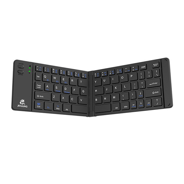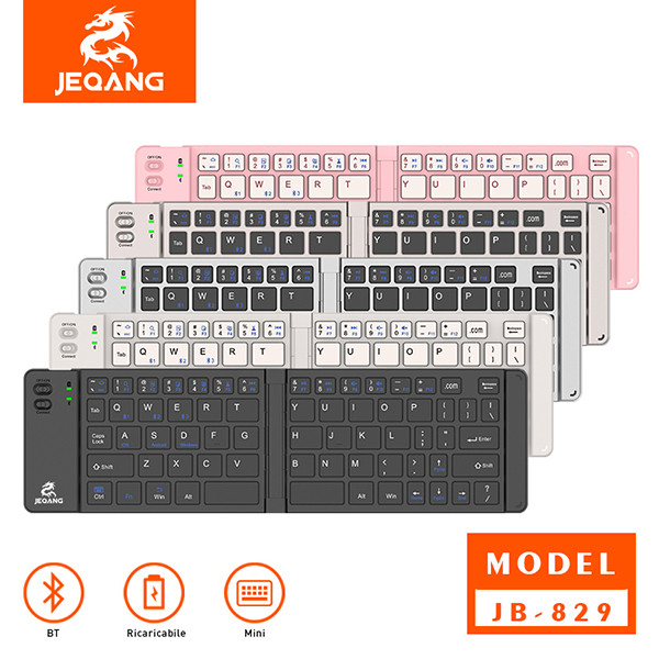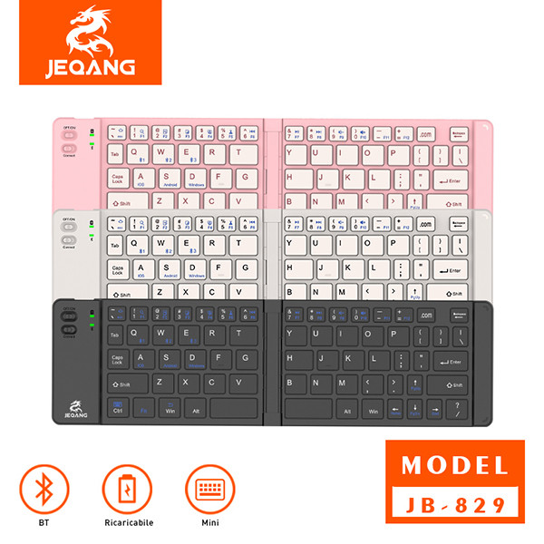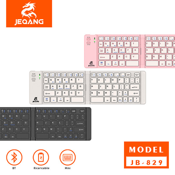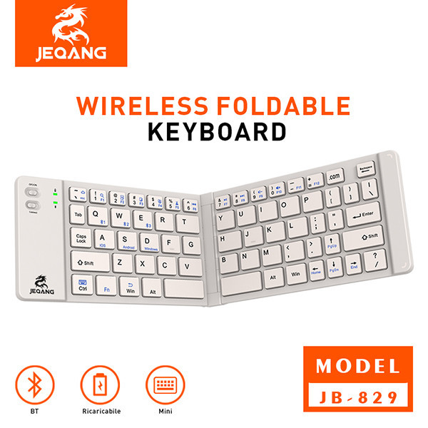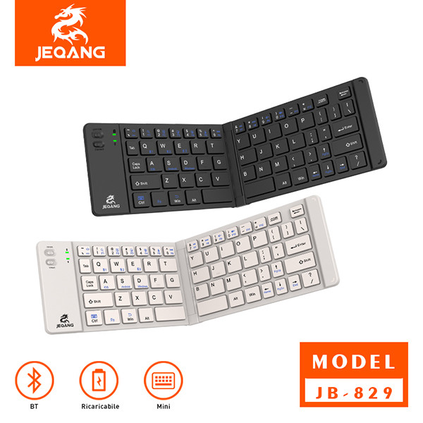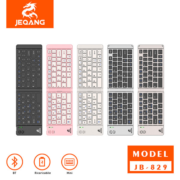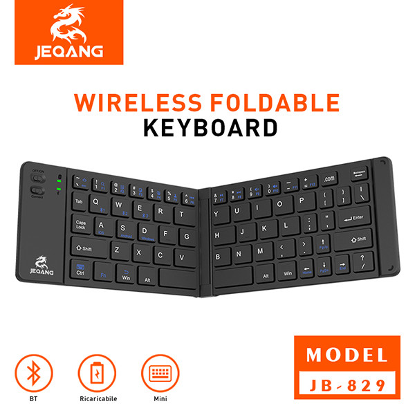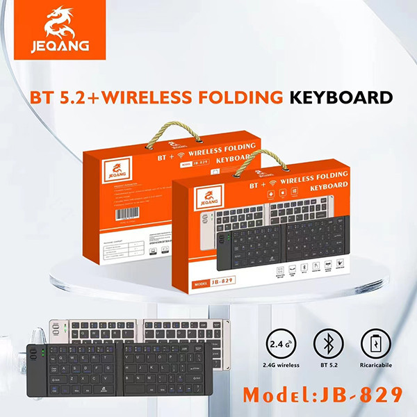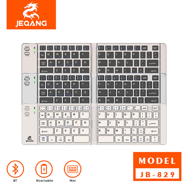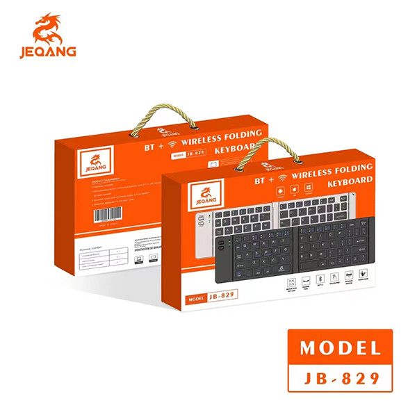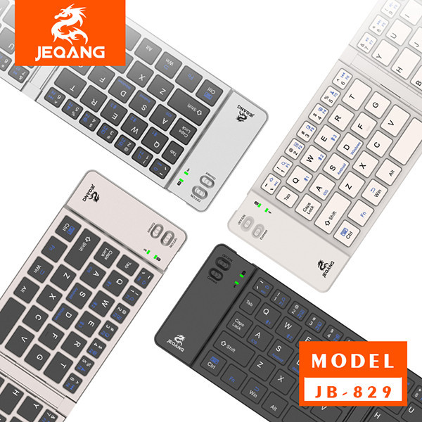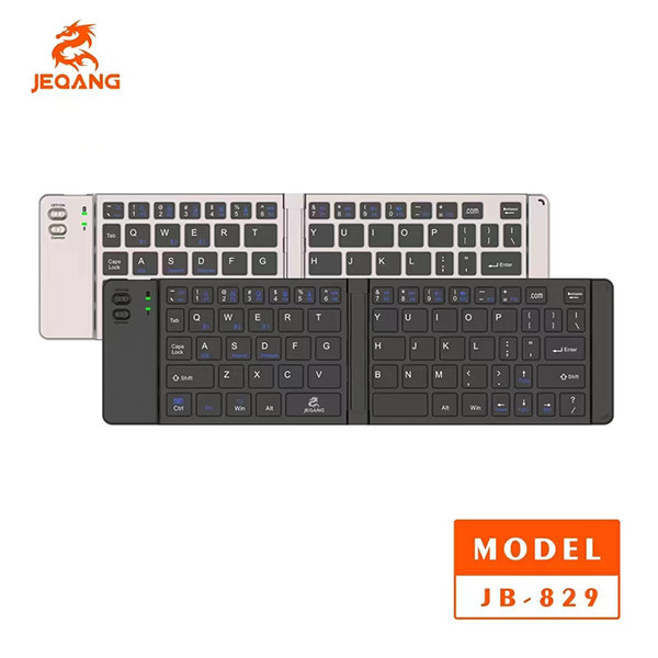کیبورد جکنگ مدل JB-829 یک کیبورد بلوتوثی با طراحی تاشو می باشد که این ویژگی آن را بسیار مناسب برای حمل و نقل و سفر می کند و با توجه به این خصوصیت زمانی که استفاده نمی شود فضای کمتری اشغال می کند. با بسته شدن کیبورد سطح کلیدها به طور خودکار محافظت می شوند و از آسیب دیدگی احتمالی جلوگیری می شود. این کیبورد از طریق بلوتوث به گوشی های هوشمند، تبلت، لپ تاپ، کامپیوتر و ... متصل می شود و فقط کافیست با روشن کردن کیبورد دکمه connect را فشار دهید.صفحه کلید را می توان به طور همزمان به سه دستگاه متصل کرد، پس از اتصال دستگاه ها، می توانید از میانبر (FN+Q/W/E) برای جابجایی آسان بین دستگاههای متصل استفاده کرد و برای اتصال به سیستم اندروید،آیفون و یا کامپیوتر دکمه FN را با دکمه A یا D و یا S به مدت چند ثانیه فشار دهید تا به آسانی به آن متصل شوید. این کیبورد دارای باطری داخلی می باشد که به وسیله یک عدد کابل که همراه کیبورد است قابل شارژ می باشد. زمان شارژ این کیبورد 2 ساعت و مدت زمان کار مداوم با آن 40 ساعت است.اگر 10 دقیقه از کیبورد استفاده نکنید به حالت خواب رفته و با فشردن یک کلید دوباره روشن میشود. سایز کیبورد 7×84×295 میلی متر و در حالت بسته 15×84×150 میلی متر است.