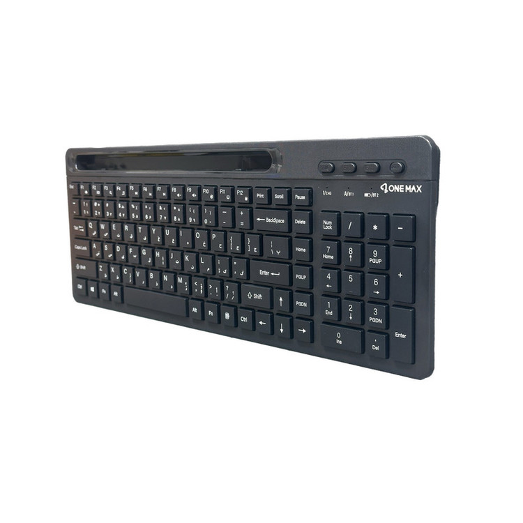 کیبورد بیسیم شارژی بلوتوثی وان مکس دارای کیفیتی بالا می باشد .کلیدهای نرم و کمصدا، تایپ کردن را سریع و دلپذیر میکنند.این کیبورد از طریق دانگل USB به راحتی به کامپیوتر و لپتاپ متصل میشود.قابلیت اتصال از طریق بلوتوث را فراهم میکند و امکان اتصال همزمان به دو دستگاه را میدهد.با دستگاههایی مانند لپتاپ، کامپیوتر، تبلت و تلویزیونهای هوشمند سازگاری کامل دارد.این کیبورد نیازی به باتری ندارد و شارژی می باشد و دکمه ای برای خاموش و روشن کردن کیبورد را نیز دارد.