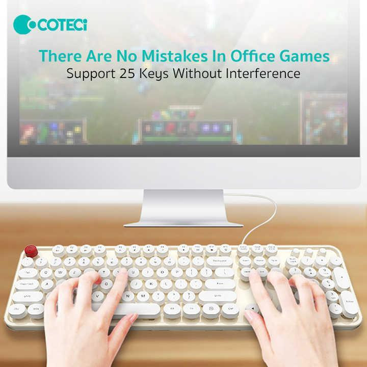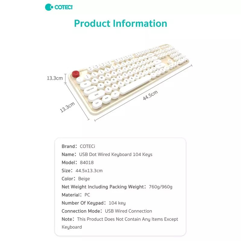 صفحه کلید Coteci 84018 یک کیبورد زیبا با طراحی برگرفته از صفحه کلید های ماشین تایپ طرح رترو با امکان اتصال از طریق سیم و درگاه USB-A است که توسط شرکت کوتتسی طراحی و روانه بازار مصرف شده است. این کیبورد دارای طراحی زیبا و ارگونومیکی است که آن را برای استفادههای طولانی مدت مناسب نموده و از خستگی دستها جلوگیری میکند. کلیدهای آن نرم و بیصدا هستند و از طراحی قطره ای بدون فرم سود می برند، که تجربه تایپ کردن را لذتبخشتر و ساکت تر میکند. این کیبورد از طریق کابل USB به کامپیوتر یا لپتاپ متصل میشود. اگر به دنبال کیبوردی زیبا و در عین حال با کیفیت و مناسب برای استفاده روزانه در منزل یا محیط کار و حتی بازی هستید، Coteci 84018 گزینهی خوبی است.