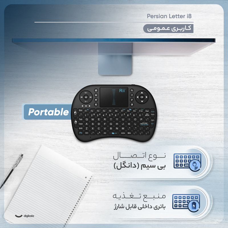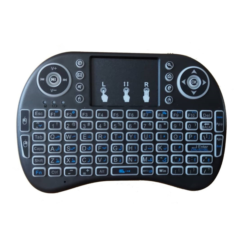 کیبورد بیسیم Persian Letter i8 یک انتخاب فوقالعاده برای افرادی است که به یک کیبورد قابل حمل، همهکاره و مجهز به نورپردازی RGB نیاز دارند. این کیبورد در ابعاد بسیار کوچک ۱۴۶x۹۷x۱۹ میلیمتر طراحی شده و تنها ۹۰ گرم وزن دارد، اما همچنان تمامی کلیدهای ضروری را در خود جای داده است. یکی از ویژگیهای متمایز این محصول، حروف فارسی حک شده روی کلیدها است که امکان تایپ راحتتر برای کاربران فارسیزبان را فراهم میکند. علاوه بر این، تاچپد داخلی تعبیه شده روی کیبورد، عملکردی مشابه ماوس را ارائه میدهد و دیگر نیازی به استفاده از ماوس جداگانه نخواهید داشت. این ویژگی، بهخصوص برای اندروید باکسها، تلویزیونهای هوشمند و دستگاههای کوچک که از ماوس پشتیبانی نمیکنند، بسیار کاربردی است. این کیبورد از طریق دانگل USB با فرکانس ۲.۴ گیگاهرتز به دستگاههای مختلف متصل شده و برد آن تا ۶ متر میرسد. نورپردازی RGB با قابلیت تنظیم رنگ و شدت روشنایی، جلوهای زیبا به این محصول بخشیده و برای استفاده در محیطهای کمنور، بسیار مفید است. انرژی این کیبورد از باتری قابل شارژ لیتیومی تأمین شده که دوام خوب و بالایی دارد و نیاز به تعویض مداوم باتری را برای کاربر از بین میبرد. کیبورد بی سیم Persian Letter i8 محصولی کوچک اما قدرتمند و کاربردی است که ارزش خرید بالایی دارد.