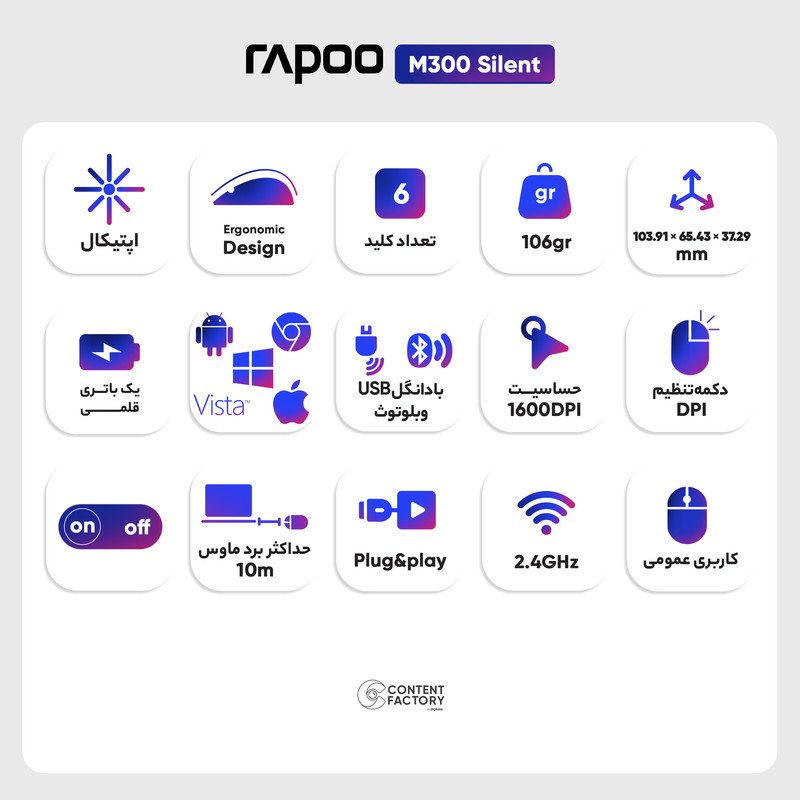 در دنیای قطعات کامپیوتری، ماوسهای بیسیم از جمله ابزارهای اساسی برای افرادی هستند که به دنبال کارایی و انعطاف بیشتر هستند. ماوس بیسیم رپو مدل M300 Silent یکی از این محصولات کارآمد است که با مشخصات فنی برتر و قابلیتهای گسترده، به عنوان یک انتخاب عالی در بازار ماوسهای بیسیم مطرح شده است. وزن این ماوس 106 گرم و ابعاد آن 103.91x65.43x37.29 میلیمتر است که با توجه به اندازه کوچک و وزن سبکاش، به کاربر امکان استفاده راحت و بدون هیچگونه خستگی را میدهد. این محصول با برخورداری از 6 کلید عملی و کاربردی، گزینهای همه جانبه به شمار میرود. این ماوس با حسگر اپتیکال با دقت 800 تا 1600 امکان استفاده بر روی سطوح مختلف ازجمله چوبی، شیشهای و سنگی را برای کاربران فراهم میکند. همچنین ماوس بیسیم رپو دارای یک باتری قلمی آلکالاین AA که بهوسیله آن کار میکند.
