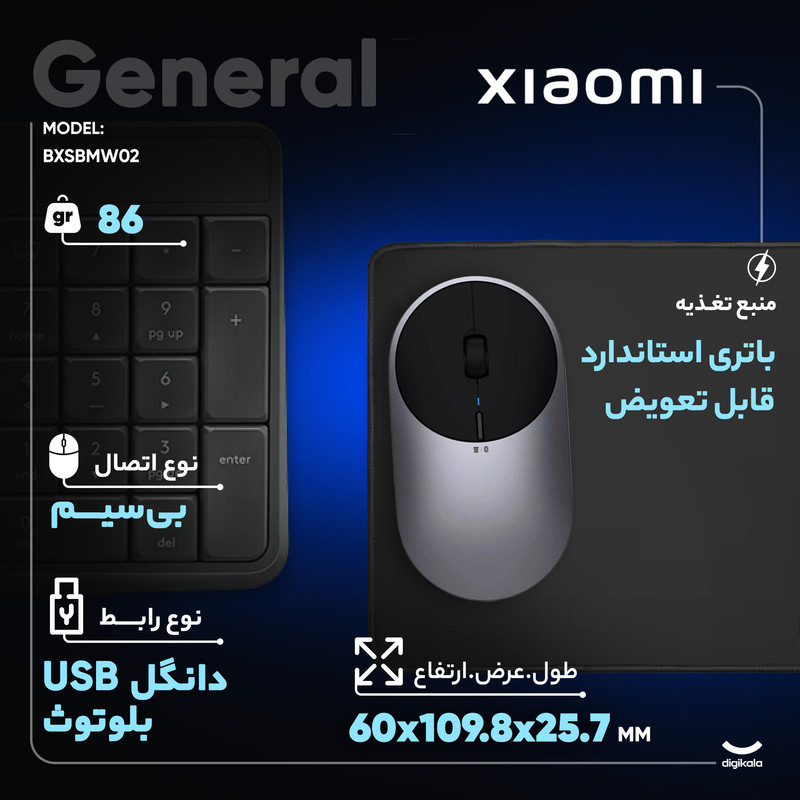 ابعاد Mi Portable Mouse 2 برابر با 109.8×60×25.7 میلیمتر بوده و وزنی تقریبا معادل 86 گرم دارد.