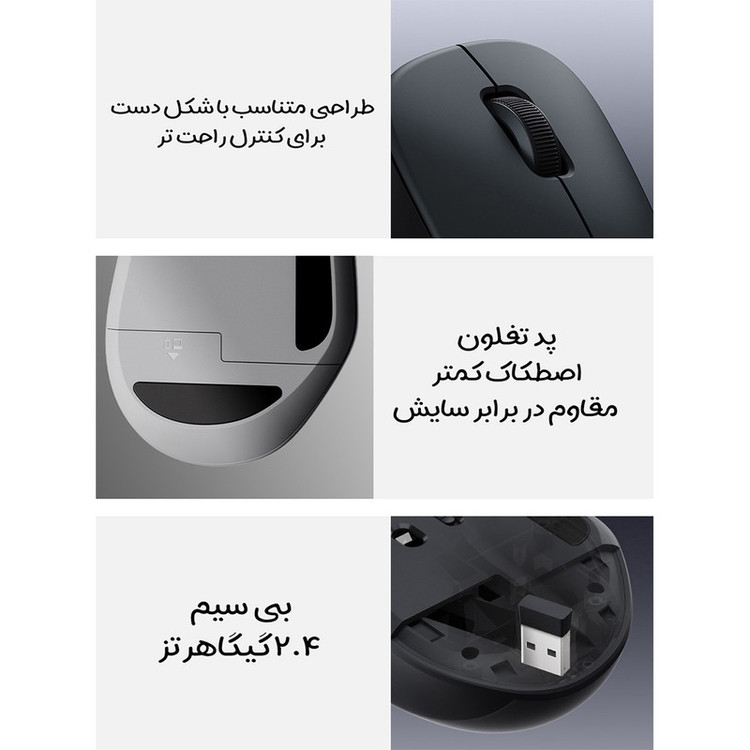 یکی از جذابترین ویژگیهای این ماوس بی سیم، دکمههای بیصدا است. سوئیچهای جدید TTC نه تنها پاسخگویی بسیار بالایی دارند، بلکه صدای کلیک را به حداقل رساندهاند. این ویژگی، محیط کاری آرامتری را فراهم میکند و تمرکز شما را حفظ میکند.دکمههای بزرگ و سطح مات این ماوس، حس نرمی و راحتی برای شما ایجاد می کند. روکش سندبلاست این ماوس، علاوه بر ایجاد ظاهری شیک، از لغزش دست جلوگیری می کند.ماوس بی سیم شیائومی مجهز به سنسور 1200 DPI است، که دقت کافی را برای انجام کارهای روزانه، از جابجایی ساده فایلهای شما تا طراحیهای گرافیکی، ارائه میدهد. این قابلیت تضمین میکند که هر حرکت شما دقیق و بدون خطا باشد.اتصال پایدار و بدون تاخیر: این ماوس بی سیم برای اتصال به یک خروجی بی سیم 2.4 گیگاهرتز متکی است. که یک اتصال پایدار و قابل اعتماد برای انتقال روان داده ها به شما ارائه می دهد.
