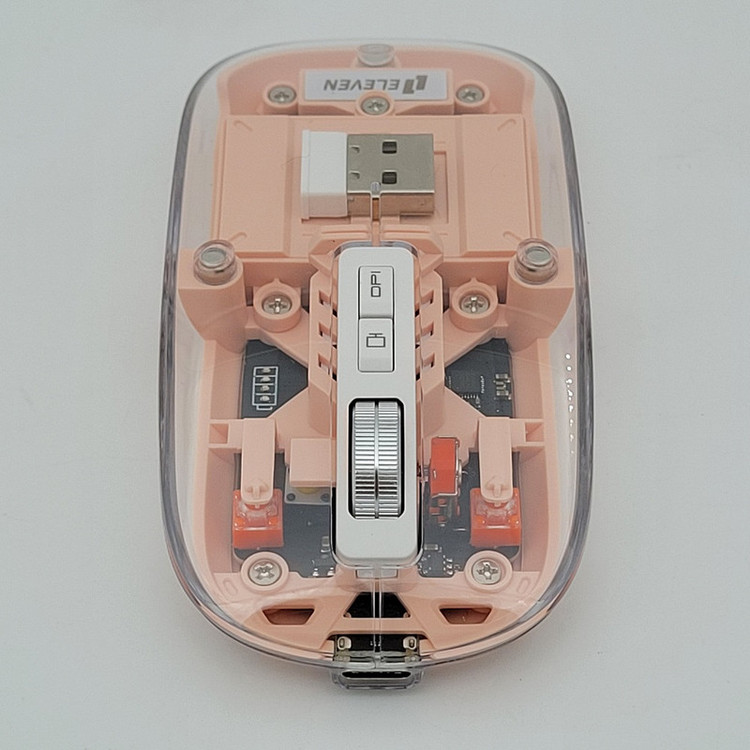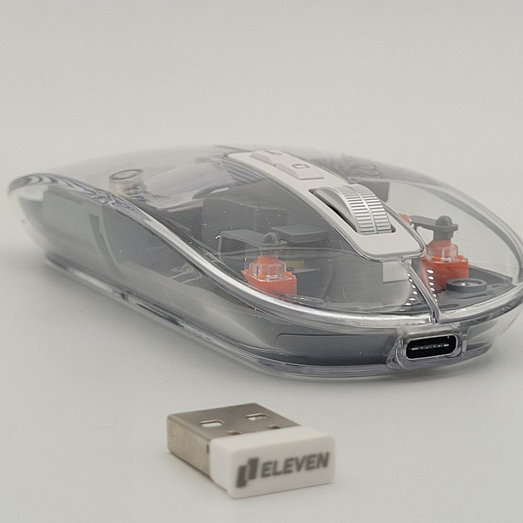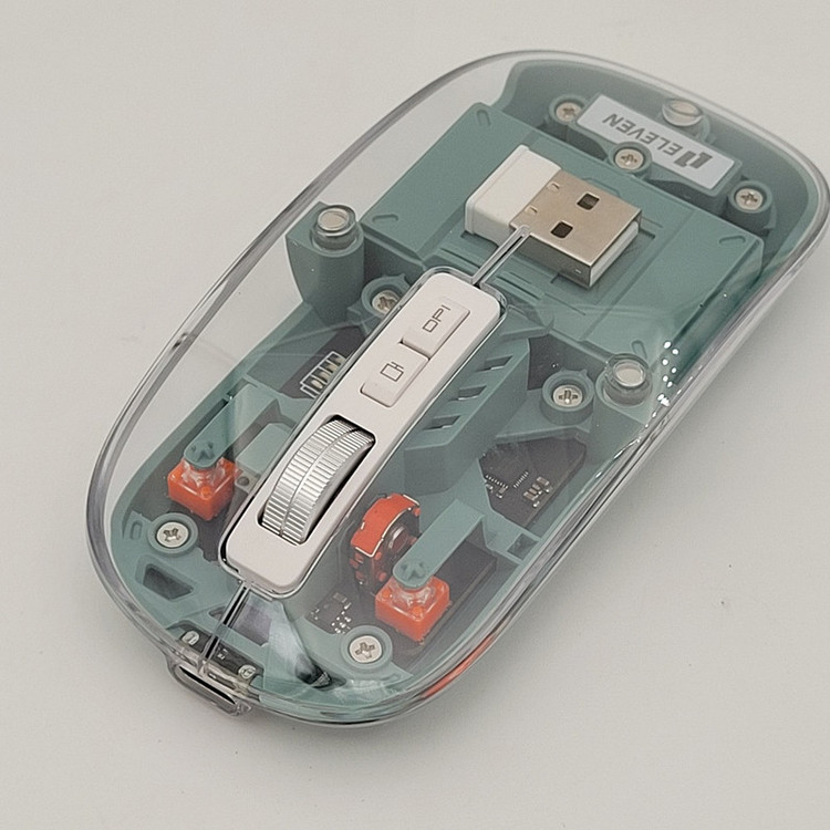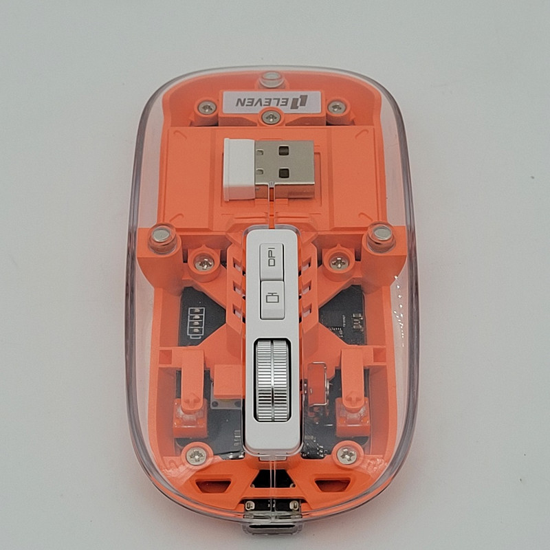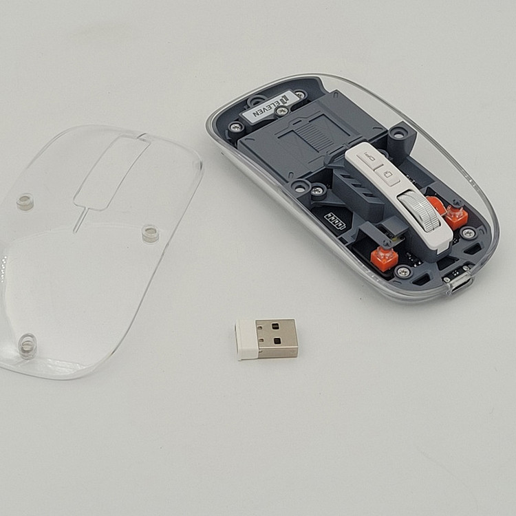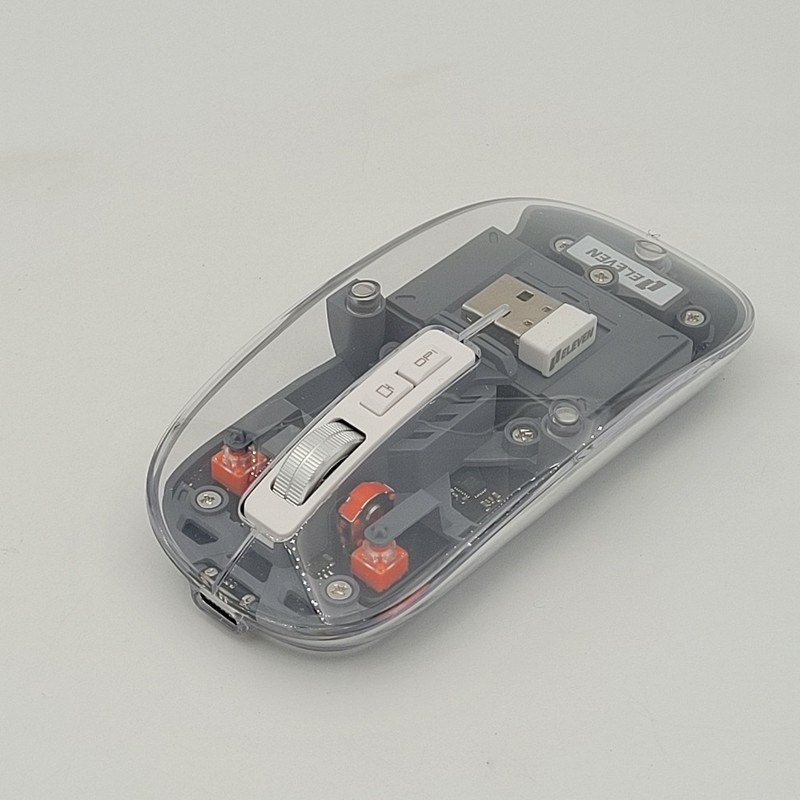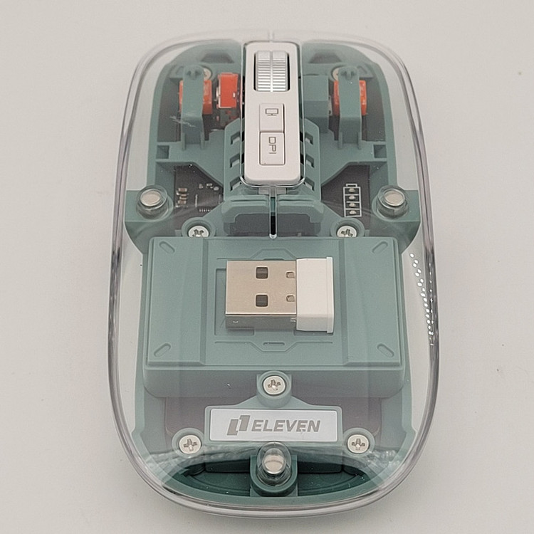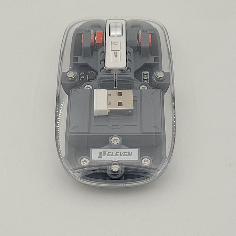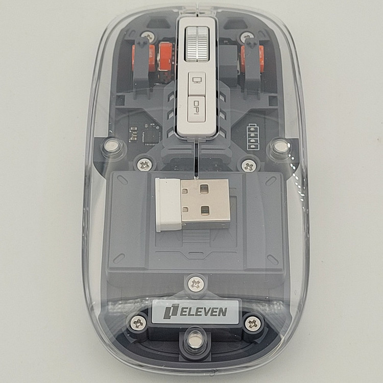 رویه این ماوس شیشه ایی هستش و داخل ماوس به زیبایی قابل دیدن هستش که به عنوان درب هم استفاده میشود و به صورت مگنتی وصل میشود تا عمر زیادی داشته باشد بعد از باز کردن آن شما میتوانید دانگل گیرنده را داخلش بگذارید تا خیالتان از گم شدن راحت باشد.