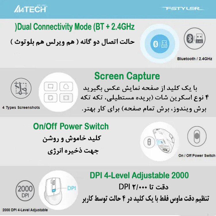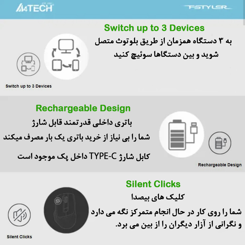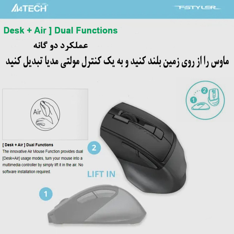 جدیدترین محصول 2025 کمپانی ای فورتک مدل FSTYLER_FB_45CS_AIR2_SILENT است.این محصول منحصر به فرد دارای ویژگی های بسیار خارق العاده ای است که تا به امروز در هیچ محصولی مشابه نبوده است.برای مثال ویژگی air2 که میتواند ماوس شما را به یک کنترل مولتی مدیا تبدیل کند.این محصول دارای 7 کلید قابل برنامه ریزی است که شما با دانلود کردن نرم افزار این ماوس میتوانید تمام کلید های این ماوس را برنامه ریزی کنید. برای مثال کدام کلید در نرم افزار zoom کند یا ... ویژگی منحصر به فرد دیگر قابلیت متصل شدن همزمان به 3 دستگاه است که میتواند هم به ویندوز و هم مک و هم اندریود و هم آیفون متصل شود و بین دستگاهای متصل سوییچ کند.قابلیت دیگر این محصول باتری لیتیومی قابل شارژ است که شما را بی نیاز از خرید باتری یک بار مصرف میکند. کلیک های این ماوس از نوع بیصدا است تا تسلط کاریر حفظ شود.این محصول با دو وانگل طراحی شده است که به صورت نر و ماده داخل یکدیگر قرار میگیرند. دانگل اول usb برای اتصال به ویندوز و دانگل دوم از نوع type-c است برای متصل شدن به گوشی و تبلت و مک بوک است. ضمن اینکه با داشتن بلوتوث میتوانید به هر دستگاهی متصل شوید.