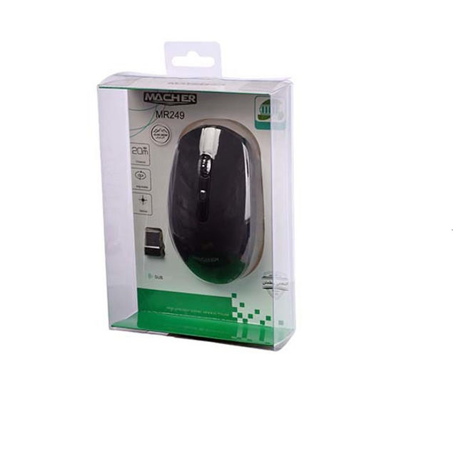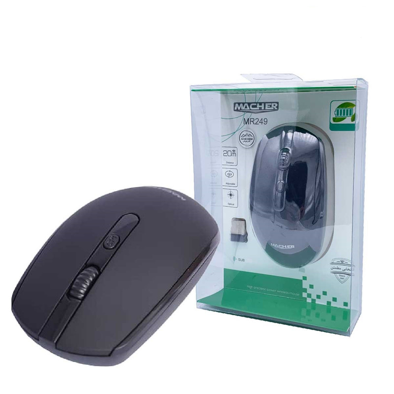 ماوس بی سیم مچر مدل MR-249، از طریق رابط دانگل USB به کامپیوتر، لپ تاپ و سایر دستگاه های دارنده این پورت متصل شده و به وسیله فرکانس 5 گیگاهرتز و اتصال بی سیم تا فاصله 20 متر کاربرد دارد. این محصول از آخرین تکنولوژی صرفه جویی در مصرف باتری پشیتبانی کرده که باعث می شود کاربران بتوانند تا 18 ماه از انرژی باتری درون ماوس بدون اختلال استفاده کنند؛ همچنین این ماوس دارای کلید روشن خاموش نیز می باشد. این محصول با بهره بردن از فناوری Plug & Play بدون نیاز به نصب و راه اندازی از تمامی سیستم عامل ها پشتیبانی می کند. حسگر اپتیکال این موس دارای سرعت و دقتی بالا بوده و محدوده دقت آن تا 1800 DPI می باشد.