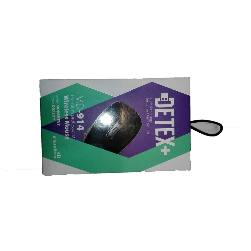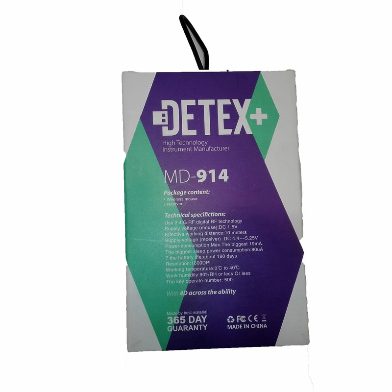 موس بلوتوث +DETEX مدل MD-914 دارای فرکانس 2.4 گیگاهرتز با رزولوشن 1600 DPI با محدوده ی فرکانسی 10 متر و یک گیرنده به شکل USB که همراه محصول ارائه شده است .