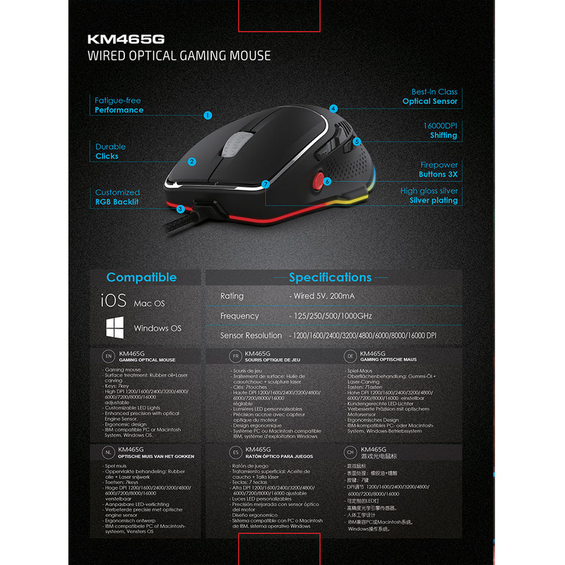 ماوسهای گیمینگ از پرطرفدارترین محصولات کمپانی کینگ استار است که با تکیه بر زیبایی و جذابیت در طراحی به بازار عرضه گردیده است. ماوس گیمینگ کینگ استار مدل KM465G با 180 سانتی متر طول کابل و جنس کنفی آن که از طریق پورت USB به سیستم متصل میگردد، امروزه مورد استفاده کاربران زیادی قرار گرفته است. از مشخصههای فنی این ماوس میتوان به مقدار جریان 200 میلی آمپر و ولتاژ 5 ولت آن هنگام استفاده، اشاره کرد.