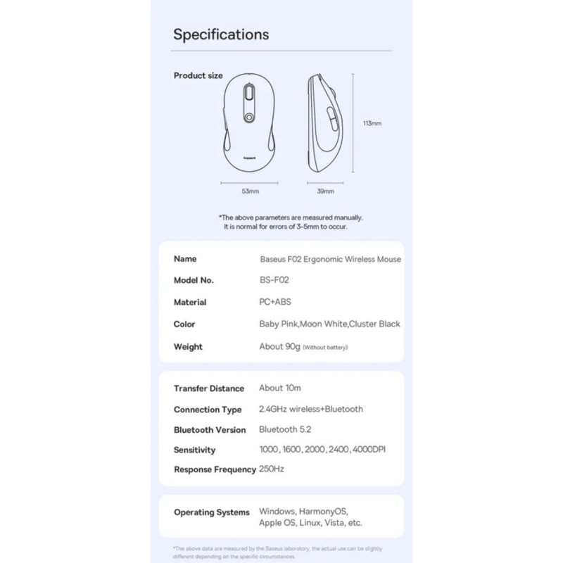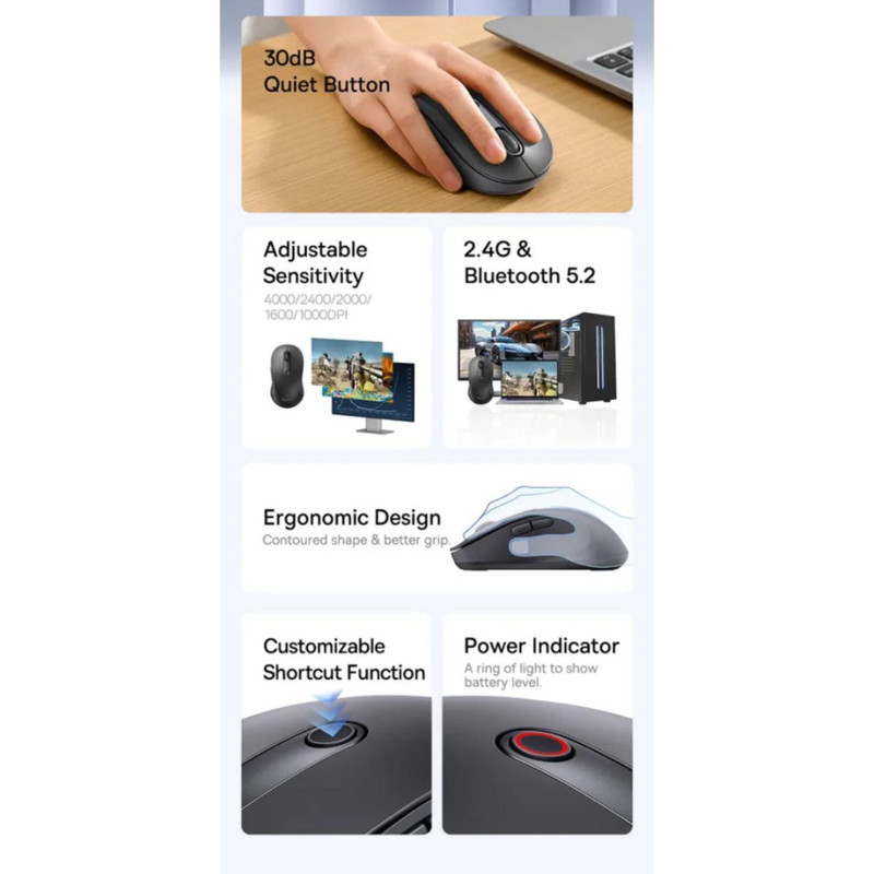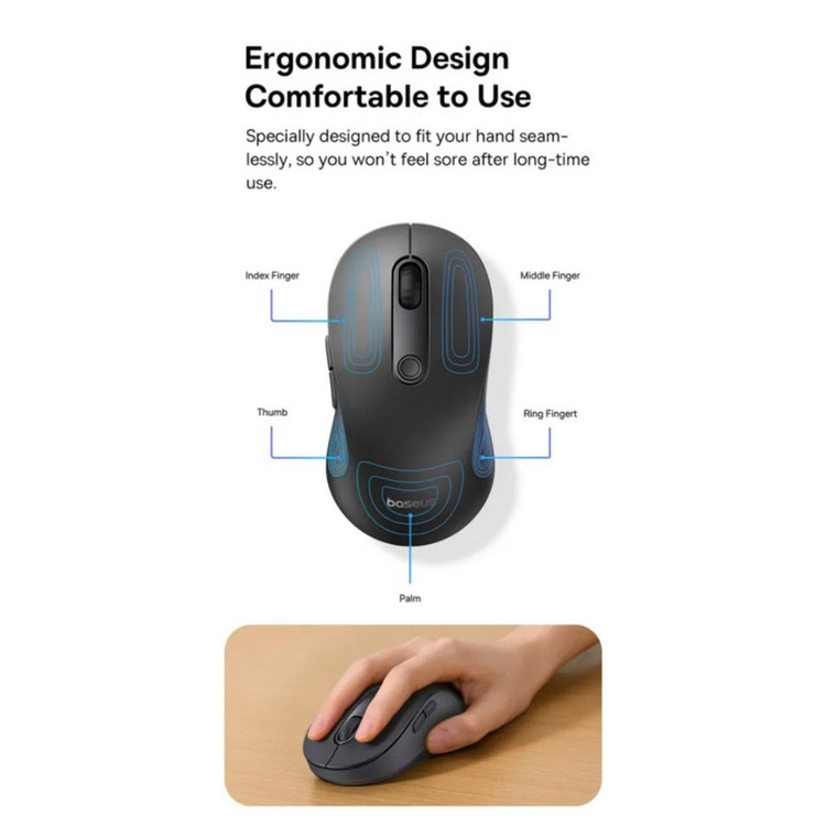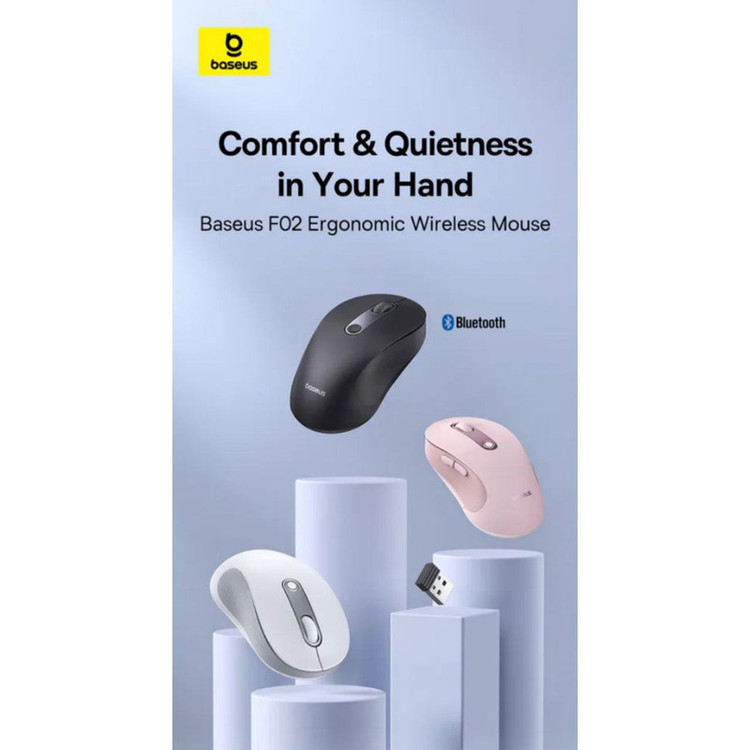 با ماوس بیسیم ارگونومیک Baseus F02 از آزادی حرکت و آزادی از سیمها لذت ببرید. به لطف اتصال بلوتوث و 2.4G، می توانید در عرض چند ثانیه به دستگاه خود متصل شوید و از پاسخگویی فوری در هر کاری لذت ببرید. این ماوس همچنین به طور جهانی با سیستم عامل های مختلف از جمله ویندوز، مک و لینوکس سازگار است.