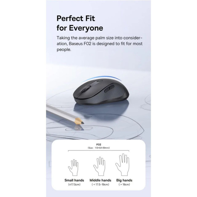 طراحی شیک و زیبای ماوس بی سیم ارگونومیک Baseus F02 جلب توجه می کند و امکان استفاده از آن را در محیط های اداری و خانگی فراهم می کند. و شکل ارگونومیک منحصر به فرد، موقعیت راحت دست را در حین استفاده تضمین می کند و از خستگی و تنش جلوگیری می کند.
