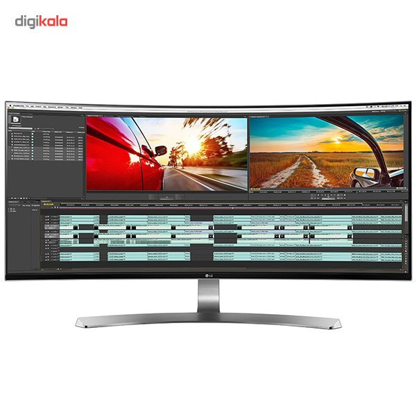 محصول «34UC98» شرکت «ال جی» یک نمایشگر بسیار عریض و خمیدهی 34اینچی با پنل IPS است که رزولوشن بسیار مطلوب 1440×3440 یا همان QHD را ارائه میدهد. زمان پاسخگویی 5 میلیثانیهای این نمایشگر آن را برای کاربردهای حرفهای بسیار مناسب ساخته است. شرکت الجی برای 34UC98 درکنار درگاه USB3.0Type-A و USB3.0Type-B، دو درگاه HDMI و دو درگاه Thunderbolt 2.0 در نظر گرفته است. درگاه Thunderbolt 2.0 قادر است با سرعت انتقال 20گیگابیت بر ثانیه عمل کند و 4برابر USB3.0 اطلاعات را انتقال دهد. همچنین پورت USB3.0 Quick Charge این محصول قادر است اقلامی مانند گوشی، تبلت و پاوربانکهایی را که از حالت Quick Charge پشتیبانی میکنند، بهصورت سریع شارژ کند. نسبت تصویر 24:9 و صفحهی بسیار عریض این محصول قابلیت نمایش چند تصویر و برنامه در کنار هم را در یک صفحه بهخوبی فراهم میسازد. قابلیت چرخش عمودی و افقی این نمایشگر برای طراحی و محیط کار مطلوب است. ال جی نرمافزار Screen Split 2.0 را همراه این نمایشگر معرفی کرده است که برای حالت تصویردرتصویر و نمایش چند نرمافزار و پنجره در کنار هم کاربرد دارد. این برنامه امکان قرار گیری تصاویر در کنار هم را به 14 شکل مختلف امکانپذیر میسازد.