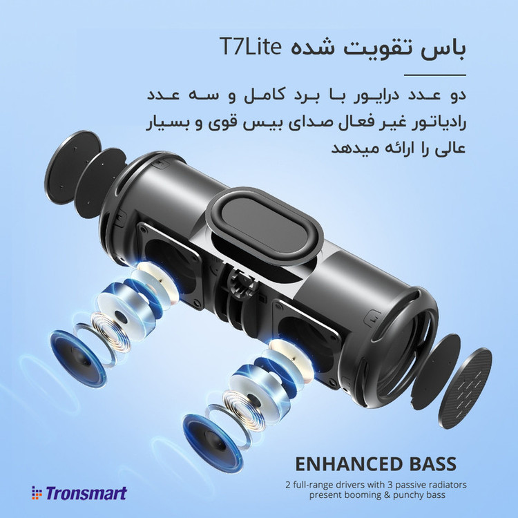 با بلندگوی Tronsmart T7 Lite بعد جدیدی از موسیقی را کشف کنید. به لطف باتری داخلی 4000 میلی آمپر ساعتی، از 24 ساعت پخش لذت ببرید. بیس قدرتمند یکپارچه و EQ قابل تنظیم کیفیت صدای متناسب با ترجیحات شما را تضمین می کند. این اسپیکر با اتصال استریو و مقاومت IPX7 در برابر آب، همراهی عالی برای هر ماجراجویی است. دارای 4 رنگ زیبا ، یک نمایش نوری تماشایی را تجربه کنید که همیشه با روحیه شما مطابقت دارد.