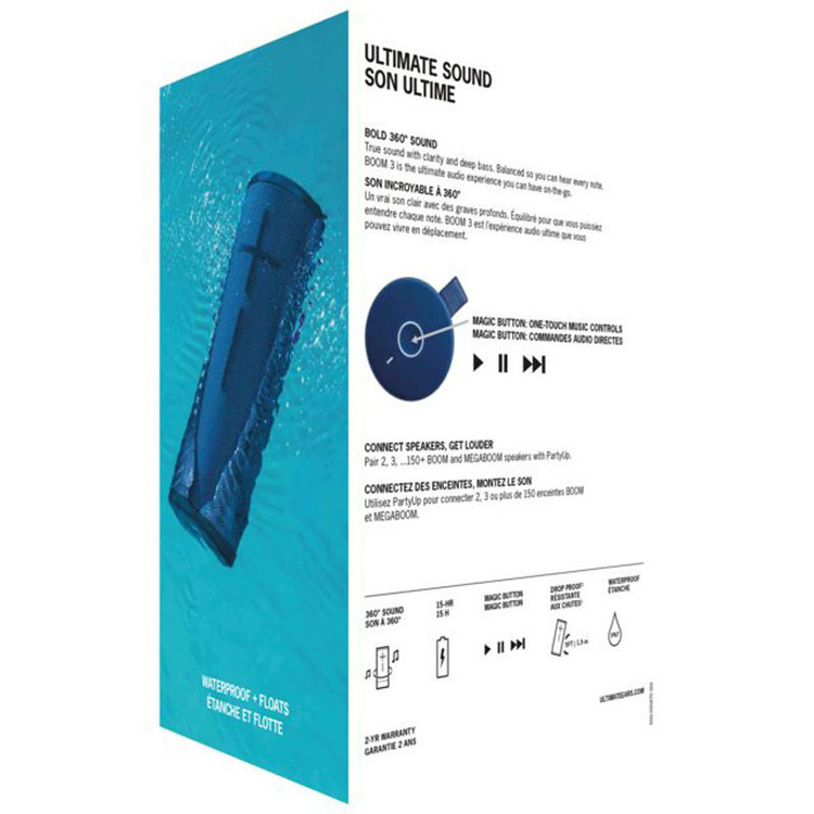 در BOOM 3 طراحی سیلندری UE بهینهسازی شدهاست و UE پرچمدار ارائه صدایی فراگیر و استریوسونیک که در تمام جهات پخش میشود است.BOOM 3 با توجه به ابعاد خود حجم صدای بسیار زیادی دارد.این اسپیکر با استفاده از پردازش صوتی انحصاری Ultimate Ears صدای با وضوح بالا و کاملا بالانس دارد که به موسیقی شما، در هر میزان بلندی صدا وفادار است.برخلاف بیشتر اسپیکرهای قابل حمل، BOOM 3 بیسی عمیق و با دقت را به موسیقی شما اصافه میکند که بیس واقعی موسیقی شماست و هیچگونه بیس بیش از حد یا دیستورشن در آن وجود ندارد.BOOM 3 به صورت هدفمندی طراحی شده تا هیجانات زندگی خودش را تحمل کند. این اسپیکر بیش از 25 تست استحکام سخت، شامل هزاران بار کلیک شدن دکمههای خود، صدها بار افتادن و زمین خوردن و بسیاری دیگر را گذرانده است. پس هرجا که دور هم جمع شوید، چه در پشت بام خانه و چه در نوک قله،BOOM 3 هوای شما را دارد.BOOM 3 با روکش پارچهای دو رنگ پوشیده شدهاست که علاوه بر مقاومت بالا زیبایی خاصی دارد. از این نوع بافت پارچهای در لباسهای موتورسواری و تجهیزات آتشنشانی استفاده میشود و آماده تحمل سختترین شرایط است. همچنین با فرآیند رنگرزی ویژهای به شکل دو رنگ ساخته شدهاست که با تغییر جهت نور، رنگ آن نیز مقداری تغییر میکند.BOOM 3 از همان فناوری باتری استفاده میکند که در خودروهای برقی محبوب استفاده میشود. BOOM 3 با هربار شارژ کامل میتواند 15 ساعت به صورت مداوم به پخش موسیقی بپردازد.BOOM 3 برای خیس شدن متولد شده و کاملا ضد آب است. با گواهینامه مقاومت به نفوظ آب و گرد و غبار IP67، این اسپیکر میتواند به مدت 30 دقیقه بدون مشکل در زیر آب بماند؛ زمانی که هم به سطح آب میآیند-چون این اسپیکر شناور است- با قدرت موسیقی شما را پخش خواهد کرد.با قابلیت PartyUp در اپلیکیشن BOOM شما میتوانید 1، 2، 3… تا بیشتر از 150 اسپیکر BOOM 2, MEGABOOM, BOOM 3, MEGABOOM 3 را به یکدیگر متصل کنید. میتوانید با اسپیکرهایتان یک دیوار درست کنید!با دانلود اپلیکیشن BOOM از قابلیتهایی مانند PartyUp، خاموش و روشن کردن اسپیکر از راه دور و امکان تنظیم اکولایزر، تنظیم آلارم با موسیقی و بسیاری دیگر بهرهمند شوید.