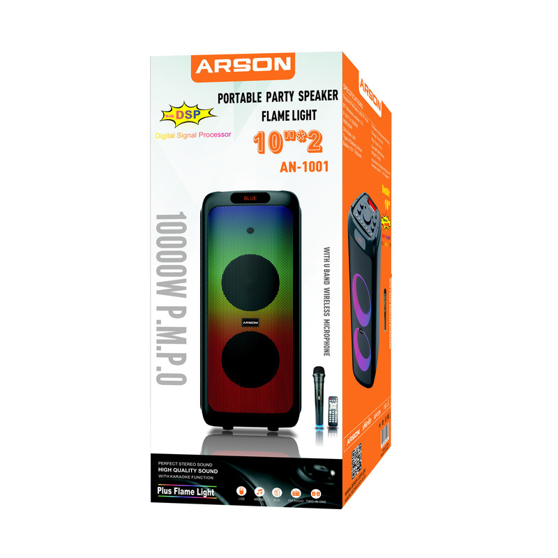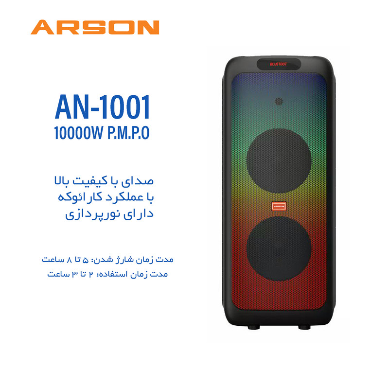 اسپیکر بلوتوثی آرسون (ARSON) مدل AN-1001 اسپیکر قابل حمل دارای باتری داخلی با توان 7000mAh میباشد و می توان آن را شارژ کرد و به مکان دلخواه خود ببریم، به همین دلیل هم بسیار پرطرفدار هستند. کمپانی های معتبر زیادی در تولید اسپیکر های قابل حمل در رقابت هستند. اسپیکر بلوتوثی مدل «AN-1001» با 2 بلندگوی 10 اینچی می باشد و دارای نورپردازی بسیار جذابی است. شما می توانید با اتصال میکروفونی که به همراه این محصول می باشد صدای خود را از اسپیکر بشنوید. همچنین می توانید یک موزیک بی کلام پخش کنید و خودتان به عنوان یک خواننده شعر مورد علاقه خود را بخوانید. مدت زمان مورد نیاز برای شارژ کامل این محصول 5 تا 8 است و پس از آن قادر است به مدت 2 تا 3 ساعت موسیقی پخش کند. در قسمت بالای این اسپیکر، کلید های مدیریت صدا، کلید «on/off»، و ورودی های کارت حافظه، فلش و «AUX» قرار دارند. در بسته بندی این محصول یک کنترل حرفه ای و میکروفن بی سیم قرار دارد.