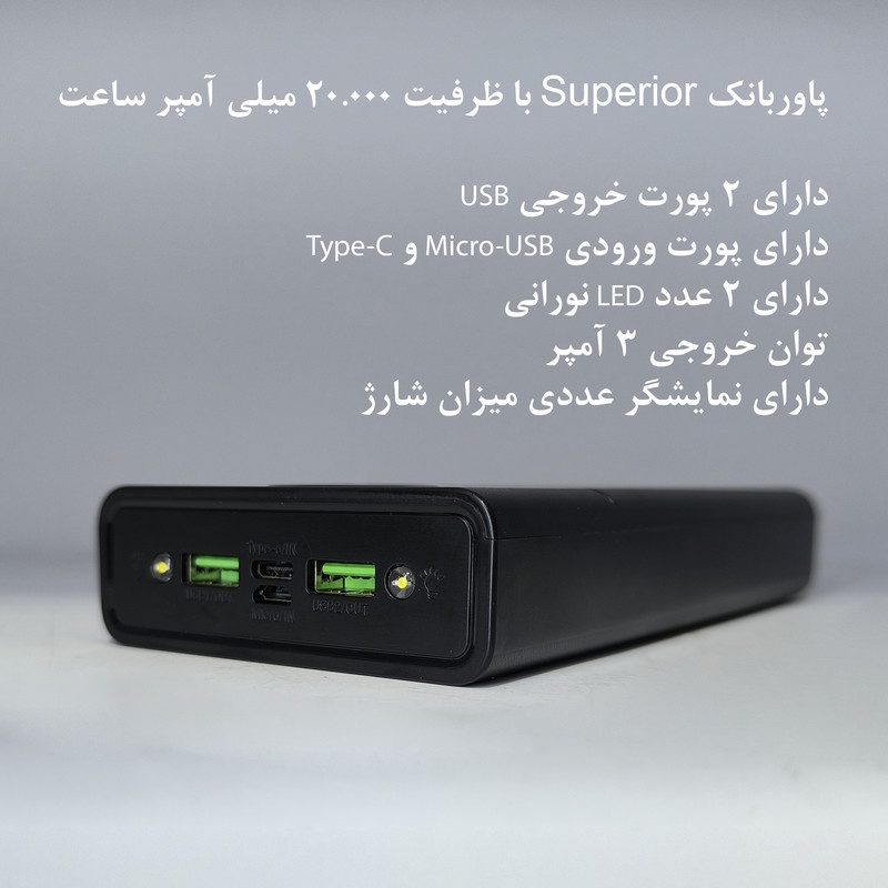 مشخصات فنی: دارای 2 پورت USB / دارای یک پورت Micro-USB / دارای پورت Type-C / دارای 2 عدد LED نورانی / توان خروجی تا 3 آمپر / دارای صفحه نمایشگر عددی میزان شارژ