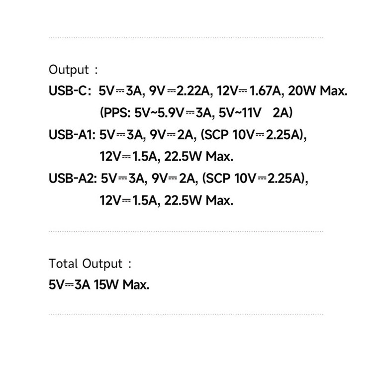 دارای سه پورت خروجی شارژ : درگاه خروجی 20 واتی تایپ سی | 2 درگاه خروجی 22.5 واتی USB-A1 / USB-A2 | Total ouput (15W) : 5V~3A (USB-C +USB-A)