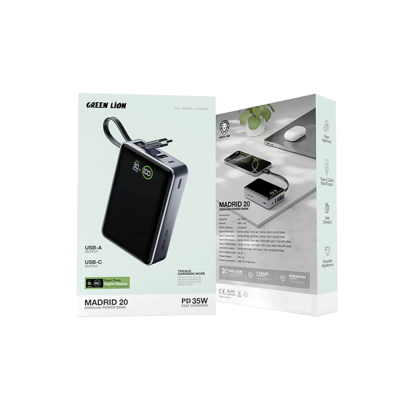 پاوربانک Green Lion Madrid 20 دارای ظرفیت باتری بزرگ 20000 میلیآمپر ساعت است که با مواد ABS و PC مقاوم برای دوام بیشتر ساخته شده است. این پاوربانک دارای شارژ سریع از طریق Power Delivery (PD) 35W با کابل و پورت Type-C است و خروجیهای ولتاژ مختلفی را برای شارژ سریع و ایمن چندین دستگاه فراهم میکند. کابل Type-C داخلی 20 سانتیمتری، شارژ را بدون نیاز به لوازم جانبی اضافی راحت میکند، در حالی که پورت USB-A دارای خروجی 22.5 وات است تا سازگاری گستردهای با دستگاهها داشته باشد. این یک پاوربانک مسافرتی است که برای پرواز تأیید شده است، به این معنی که میتوانید آن را در هر کجا که سفر میکنید با خود حمل کنید. طراحی شیک و پیچیده آن با فناوری شارژ ایمن آن برای تأمین برق ایمن و کارآمد در هر کجا که به آن نیاز دارید، مطابقت دارد.