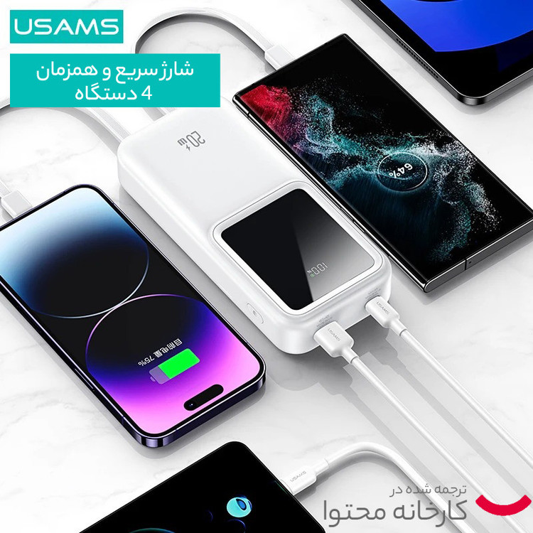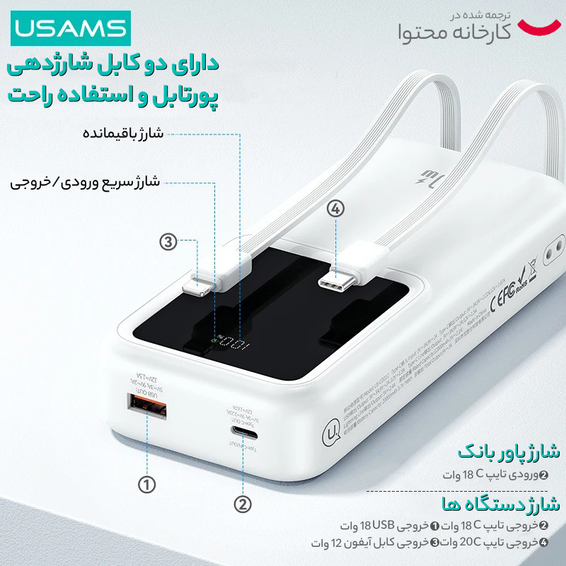 پاوربانک US-CD212 یکی از محبوب ترین و با کیفیت ترین پاوربانکهای یوسمز به شمار میرود. این محصول قابلیت های زیادی به نسبت قیمت آن دارد . داشتن یک کابل لایتنینگ و یک تایپ سی متصل به آن، فست شارژ 20 واتی ، قابلیت شارژ 4 دستگاه به صورت هم زمان و دارای تکنوژی پیشرفته و مخصوص آیفون 14 و 15 است که شما را بینیاز به کابل شارژ میکند. در صورتی که نیاز به حمل مداوم یک پاور بانک دارید این محصول بسیار کاربردی خواهد بود. پاور بانک یوسمز مدل CD212 علاوه بر کابلهای متصل دارای دو خروجی است که یکی از آن ها پورت USB بوده و به شما این امکان را می دهد تا بتوانید گوشی خود را با شدت جریان و ولتاژ 5V-3A, 9V-2A, 12V-1.5A شارژ کنید و دیگر خروجی این پاوربانک پورت تایپ سی است که هم بهعنوان ورودی برای شارژ پاوربانک و هم خروجی استفاده میشود که حداکثر خروجی این پاوربانک 20 وات میباشد. خروجیهای پاور بانک usams مدل CD212 از فناوری فست شارژ PD و QC بهره میبرند و میتوانند گوشی شما را را با سرعت بالا شارژ کند. همچنین پاوربانک یوسمز مجهز به یک چیپست هوشمند است که قادر به محافظت از باتری گوشی شما در برابر نوسانات و اتصالات کوتاه است بهگونهای که شدت جریان خروجی از پاوربانک را با شدت جریان ورودی گوشی شما یکسان میکند تا هیچ گونه آسیبی به باتری گوشی شما وارد نشود. بر روی بدنه پاوربانک فست شارژ usams نمایشگر دیجیتال قرار داده شده که با فشار دادن دکمه پاور مشاهده میشود که میزان شارژ باتری پاوربانک را به شما نشان بدهد.