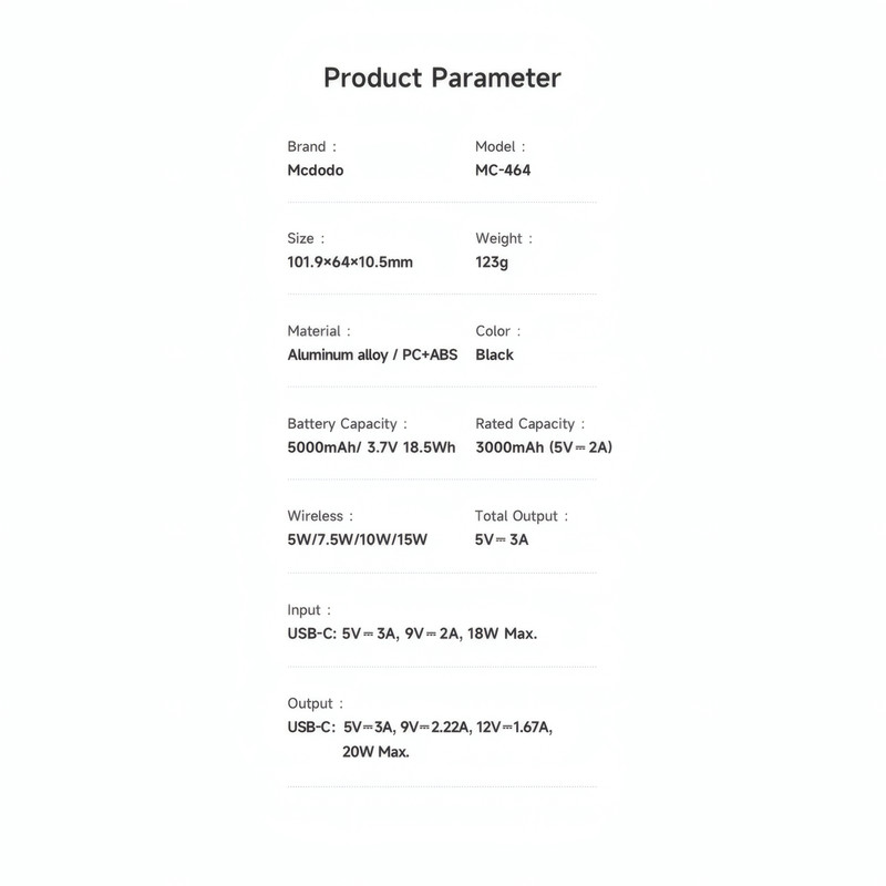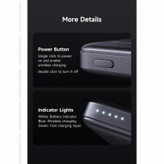 ابعاد: 10.5×64×101 میلیمتر وزن: 123 گرم ظرفیت اسمی: 5000 میلیآمپر ساعت جنس بدنه: آلیاژ آلومینیوم + ABS درگاه ورودی: تایپ C (حداکثر 18 وات) درگاه خروجی: تایپ C (حداکثر 20 وات) و پد شارژ وایرلس (حداکثر 15 وات)