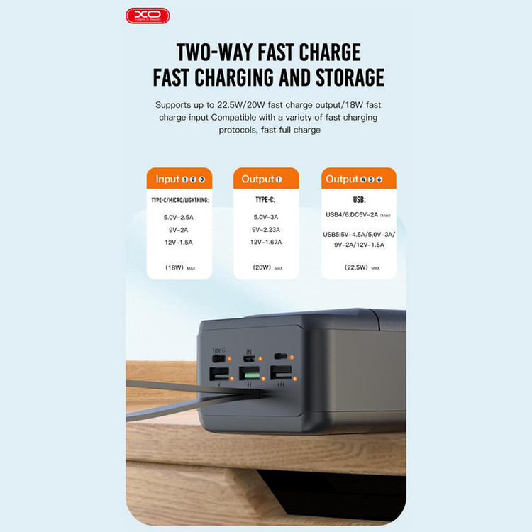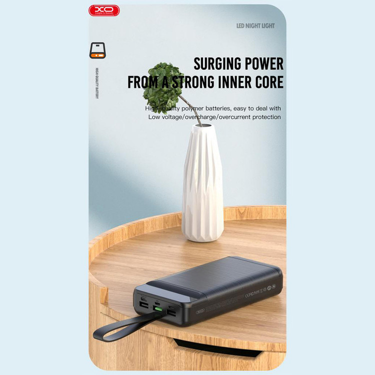 پاوربانک XO PR158 از نوع پلیمری و دارای ظرفیت اسمی به اندازه 50000 میلی آمپرساعت است. البته حتما در نظر داشته باشید ظرفیت اسمی با توجه به ولتاژ شارژ گوشی شما تغییر می کند. شما علاوه بر تلفن همراه، اسمارت واچ، تبلت و هندزفری بلوتوثی خود را نیز می توانید با آن شارژ کنید.
