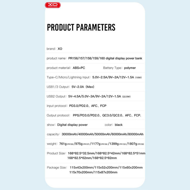 پاوربانک ایکس او PR158 از ABS و PC ساخته شده است. ابعاد آن برابر 168x82.5x51 میلیمتر و وزنی برابر 1177 گرم دارد.
