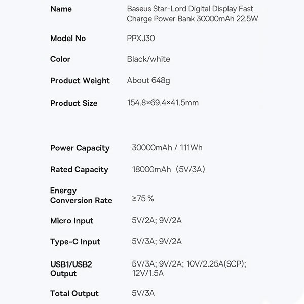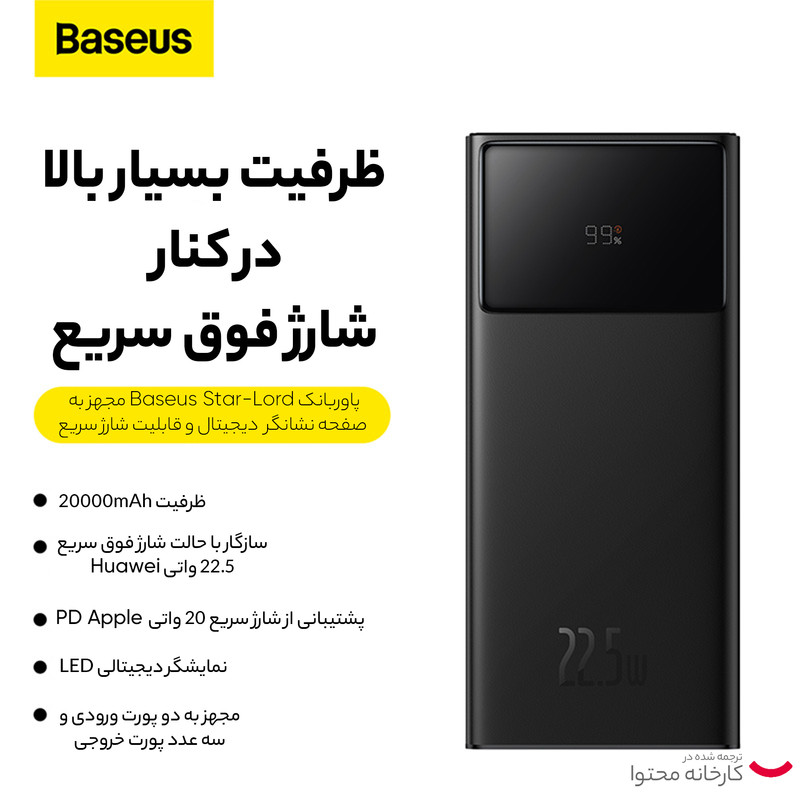 پشتیبانی از فناوری شارژ سریع QC و PD - سطوح ایمنی چند گانه - دارای 2 درگاه USB و 1 درگاه Type C خروجی - صفحه نمایش دیجیتال نشانگر درصد باتری - حداکثر توان خروجی 22.5 وات