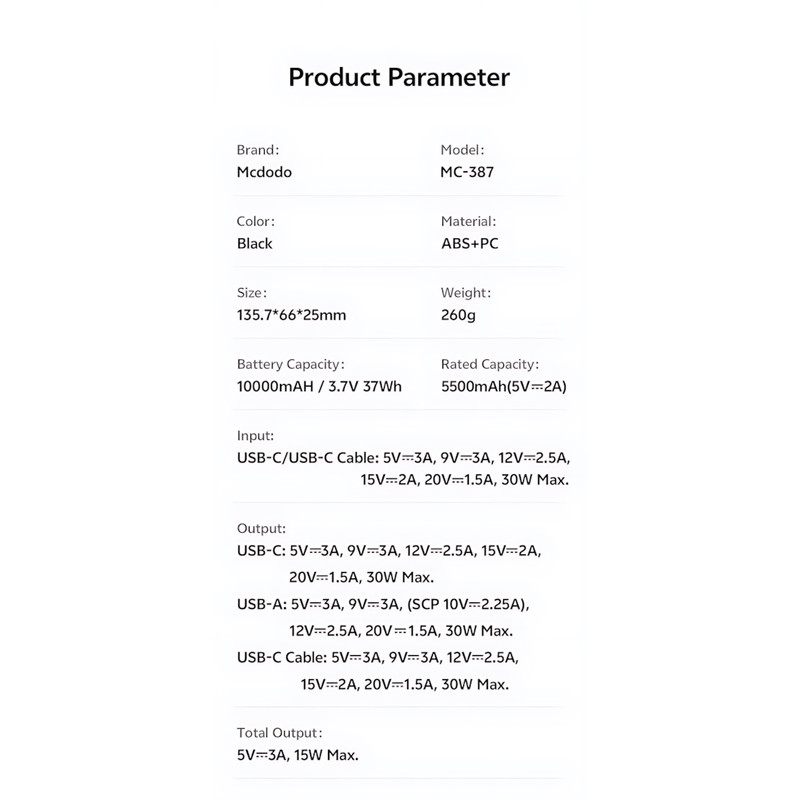قابلیتهای ویژه : کابل متصل به بدنه , فناوری USB PD , شارژ ایمن (MultiProtect) , تکنولوژی Quick Charge 3.0 , امکان شارژ کردن سریعتر موبایل (با شدتجریان 2.0 آمپر و بالاتر)