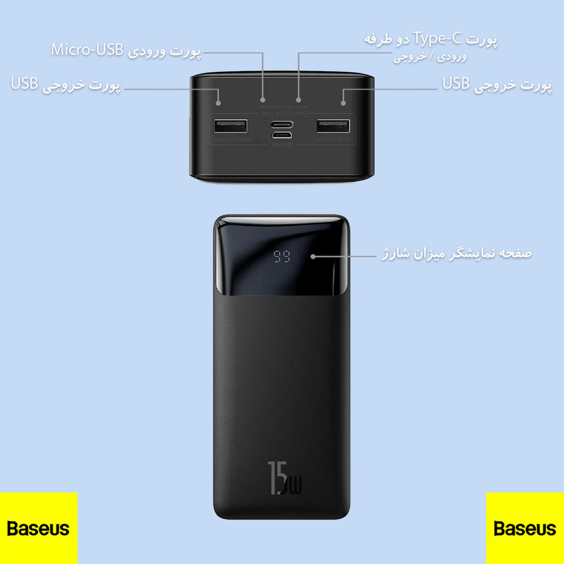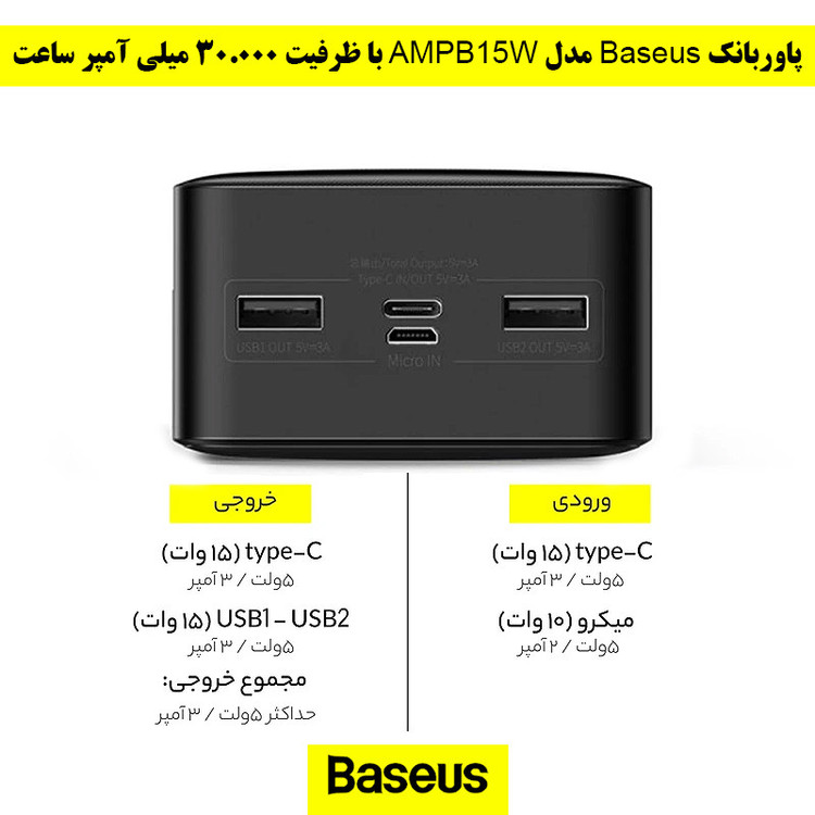 مشخصات فنی: توان خروجی : ۱۵ وات / تعداد درگاه خروجی : ۳ عدد / دارای یک ورودی و خروجی USB-C و دو عدد پورت خروجی USB-A / ظرفیت باتری : 3۰۰۰۰ میلی آمپر بر ساعت