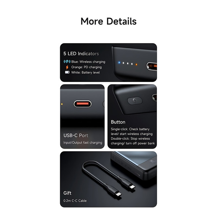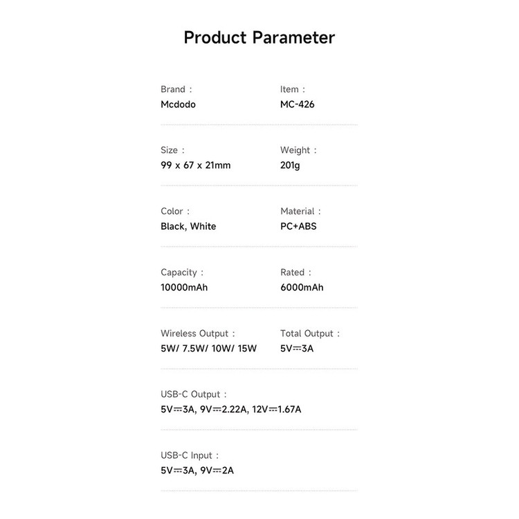 Input:USB-C: 5V⎓3A, 9V⎓2A Output:5V⎓3A, 9V⎓2.22A, 12V⎓1.67A 20W Max Wireless Output:15W / 10W / 7.5W / 5W Total Output: 5V⎓3A