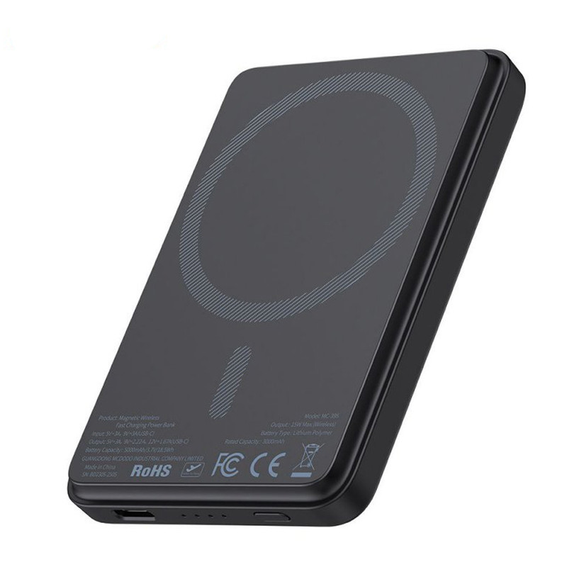پاوربانک مک دودو مدل MC-395 ظرفیت 5000 میلی آمپر ساعت مناسب گوشی های آیفون 12 و جدیدتر است. این محصول به صورت مگنتی به گوشی متصل میشود و شارژ به صورت وایرلس انجام می شود. حداکثر توان خروجی وایرلس در پاوربانک مک دودو مدل MC-395 ظرفیت 5000 میلی آمپر ساعت، 15 وات می باشد. یک پورت Type C نیز بر روی این محصول وجود دارد که هم برای شارژ کردن و هم برای شارژ شدن با توان 20 وات قابل استفاده است. البته باید دستگاه شما از این توان و تکنولوژی فست شارژ پشتیبانی کند.