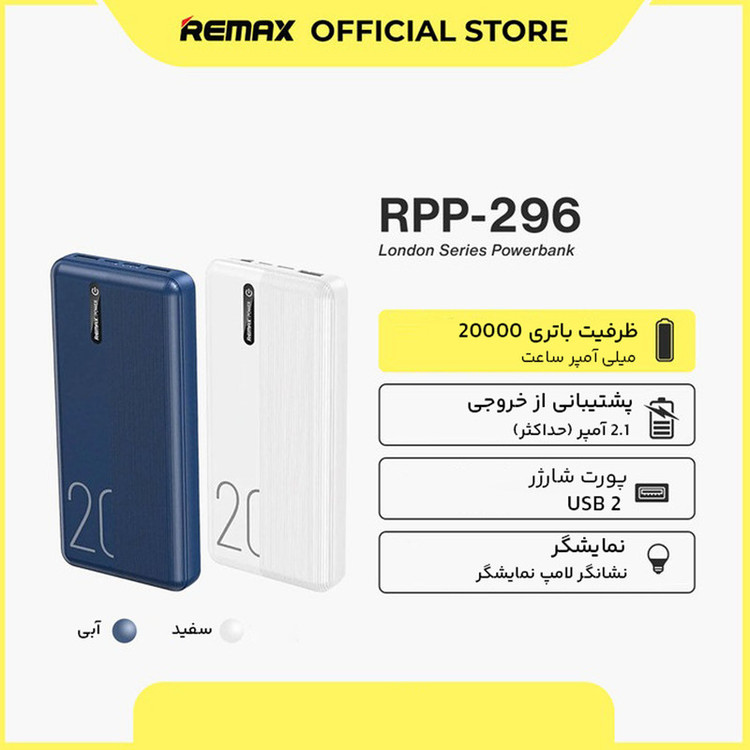 پاوربانک ریمکس مدل RPP-296 ظرفیت 20000 میلی آمپر ساعت