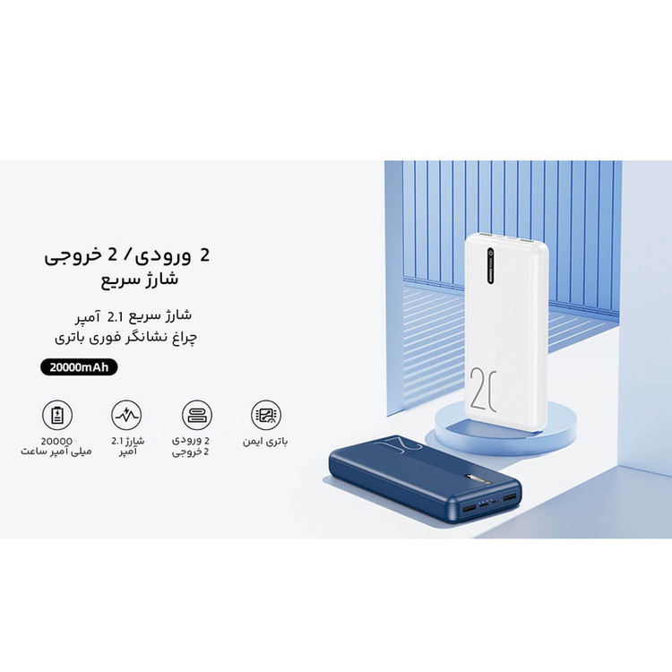 - دارای 2 پورت ورودی microUSB و Type-C با جریان 2 آمپر - دارای 2 پورت خروجی Fast Charge با جریان 2.1 آمپر - دارای نمایشگر LED به منظور نمایش درصد شارژ باقیمانده دستگاه - محافظت چندگانه در برابر شدت جریان، اتصال کوتاه، اختلاف ولتاژ، گرد و غبار
