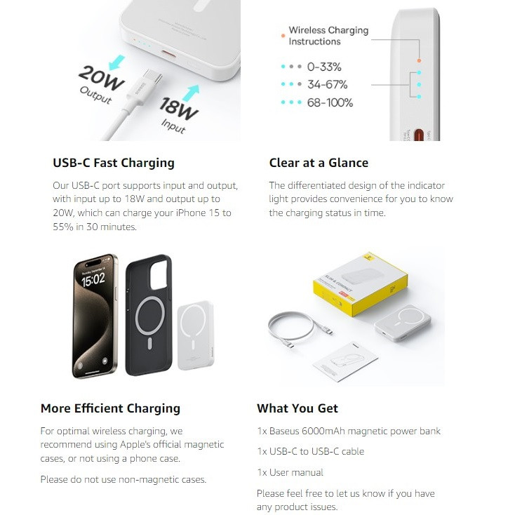 مشخصات فنی: سبک وزن، شارژ سریع، اندازه جیبی، شارژ بی سیم، نسخه ارتقا یافته 2024، تجربه شارژ را بهینه می کند و تولید گرما را در طول شارژ بی سیم کاهش می دهد.