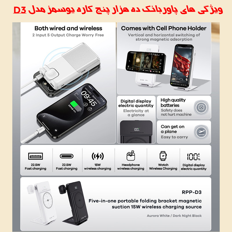 امکان شارژ همزمان 5 دستگاه- نمایشگر دیجیتالی برای نمایش میزان شارژ باقیمانده-طراحی سبک و قابل حمل-قابلیت تاشو- استفاده به عنوان هولدر موبایل- قابلیت شارژ از طریق سیم و بی سیم- پشتیبانی از شارژ سریع PD و QC